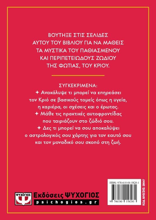 Ξεκίνα ένα μαγευτικό ταξίδι αυτοανακάλυψης με αυτόν τον σύγχρονο οδηγό για την αρχαία σοφία των ζωδίων. Βούτηξε στις σελίδες αυτού του βιβλίου για να μάθεις τα μυστικά του παθιασμένου και περιπετειώδους ζωδίου της φωτιάς, του Κριού. Συγκεκριμένα: * Ανακάλυψε τι μπορεί να επηρεάσει τον Κριό σε βασικούς τομείς όπως η υγεία, η καριέρα, οι σχέσεις και ο έρωτας.* Μάθε τις πρακτικές αυτοφροντίδας που ταιριάζουν στο ζώδιό σου. * Δες τι μπορεί να σου αποκαλύψει ο αστρολογικός σου χάρτης για τον εαυτό σου και τον μοναδικό σου σκοπό στη ζωή.