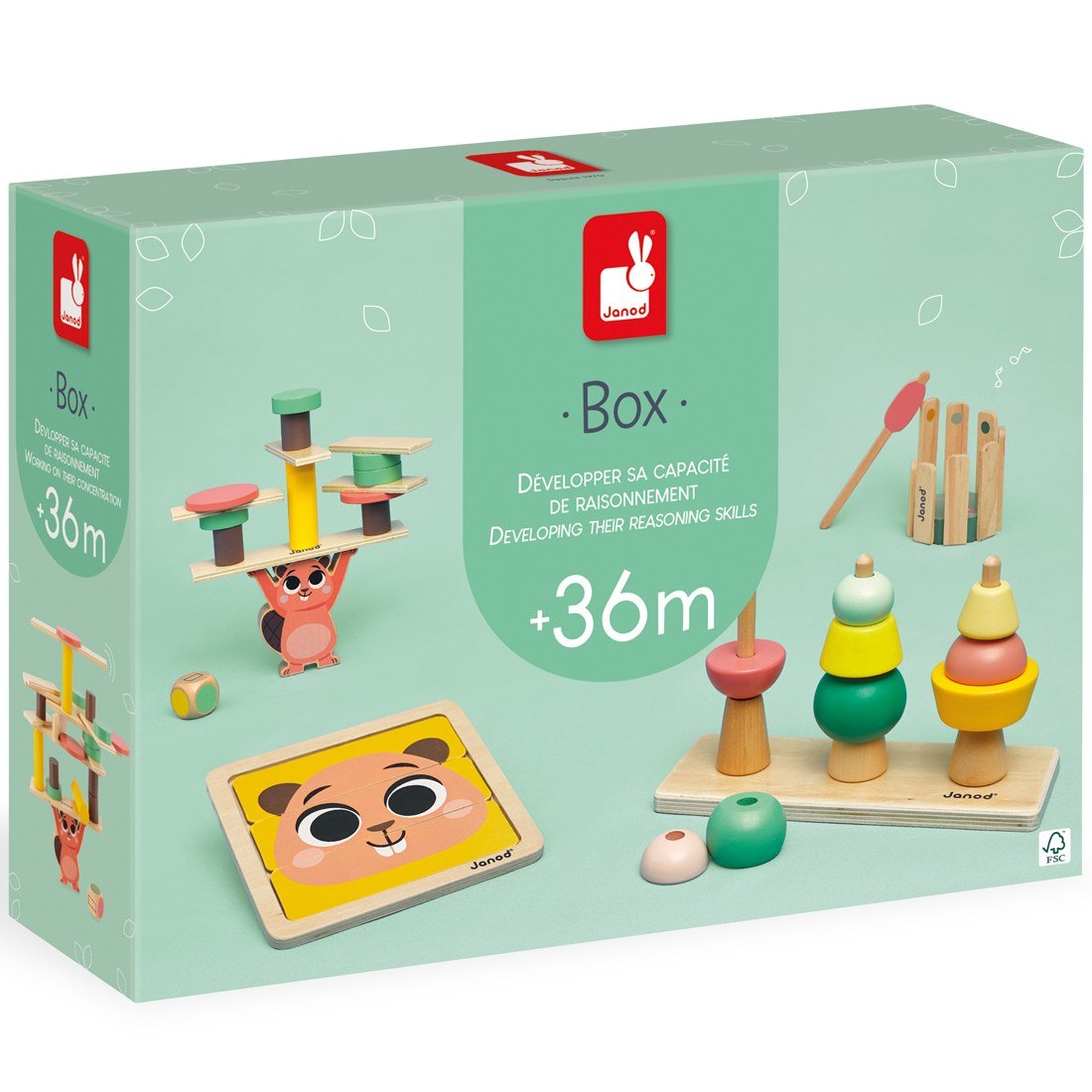 Ένα κουτί με εκπλήξεις που περιλαμβάνει 4 παιχνίδια σχεδιασμένα με γνώμονα την πρώιμη μάθηση των παιδιών. Αυτό το κουτί έχει αναπτυχθεί σε συνεργασία με έναν ειδικό ψυχοκινητικής για να βοηθήσει στη σταδιακή προώθηση της ψυχοκινητικής ανάπτυξης του παιδιού σας και στη μελλοντική απόκτηση δεξιοτήτων. Το περιεχόμενο περιλαμβάνει παιδικό παιχνίδι στοίβαξης γεωμετρικών σχημάτων, ένα παιχνίδι επιδεξιότητας «Σούπερ Κάστορας», ένα παιχνίδι με ηχητικά εφέ λιμνούλας και ένα παιχνίδι έκφρασης προσώπου. Αυτά τα 4 παιχνίδια από ξύλο και χαρτόνι διαθέτουν το καθένα μια διαφορετική λειτουργία ανάπτυξης του παιδιού. Παρέχεται επίσης ένα λεπτομερές φυλλάδιο για να σας βοηθήσει να αξιοποιήσετε στο έπακρο το κουτί. Παρέχει πληροφορίες σχετικά με τους τομείς ανάπτυξης για παιδιά ηλικίας 36 μηνών, εκτός από τις περιγραφές κάθε παιχνιδιού και τον εκπαιδευτικό του στόχο. Παιχνίδι πρώιμης μάθησης από ξύλο και χαρτόνι FSC.