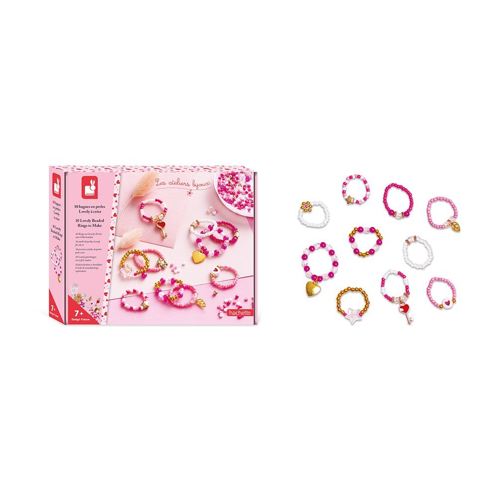 Μια συλλογή από υπέροχα δαχτυλίδια! Αυτό το δημιουργικό σετ σας δίνει τη δυνατότητα να φτιάξετε 10 υπέροχα δαχτυλίδια από χάντρες: ροζ, κόκκινα, με καρδιές. Περιέχει 300 στρογγυλές χάντρες, 40 χρυσές χάντρες, 16 διάφανες χάντρες, 15 ροζ διάφανες πολυεδρικές χάντρες, 6 διαχωριστικές χάντρες, 3 φυλαχτά, 2 χάντρες-αστέρια, 1 χάντρα σε σχήμα καρδιάς, ελαστικό νήμα, 1 κύπελλο και 1 βιβλιαράκι με οδηγίες και σχέδια. Αυτή η δραστηριότητα βοηθά τα παιδιά να αναπτύξουν τη δημιουργικότητα και την υπομονή τους και απαιτεί περίπου 10 λεπτά για κάθε δαχτυλίδι. Είναι ιδανικό για παιδιά ηλικίας 7 ετών και άνω.