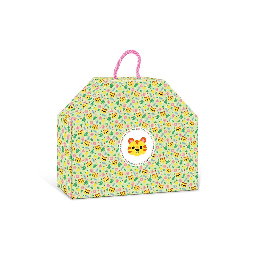 Δημιουργήστε το δικό σας σετ με ξύλινα κοσμήματα! Αυτό το σετ σάς δίνει τη δυνατότητα να φτιάξετε 1 κολιέ, 1 βραχιόλι και 2 δαχτυλίδια με θέμα τη ζούγκλα, χάρη σε μια εξαντλητική γκάμα υλικών: 2 ξύλινες χάντρες με σχήματα και σχέδια, 3 στρογγυλές τυπωμένες ξύλινες χάντρες, 33 πολύχρωμες στρογγυλές χάντρες, 22 χρυσές χάντρες, 2 δαχτυλίδια με ξύλινες επίπεδες χάντρες με τύπωμα, 1 καρτέλα με 8 διαμαντάκια, 1 ελαστικό νήμα και 1 βιβλιαράκι με οδηγίες και σχέδια. Το κουτί γίνεται μια χαριτωμένη τσάντα στην οποία μπορείτε να φυλάτε τα κοσμήματά σας και άλλα μικρά μυστικά. Αυτή η δραστηριότητα βοηθά την ανάπτυξη της δημιουργικότητας και κινητικές δεξιότητες και είναι κατάλληλη για παιδιά ηλικίας 4 ετών και άνω.