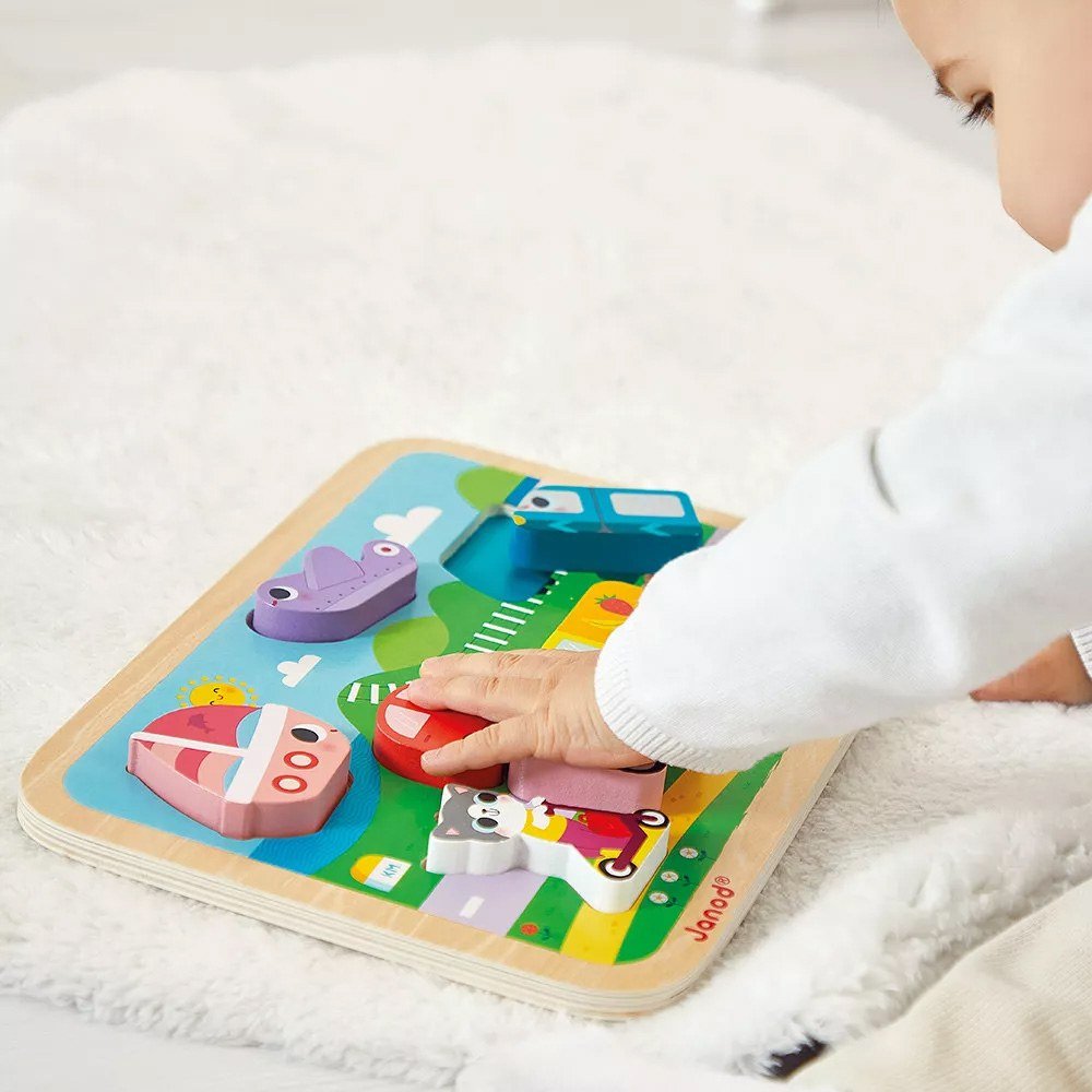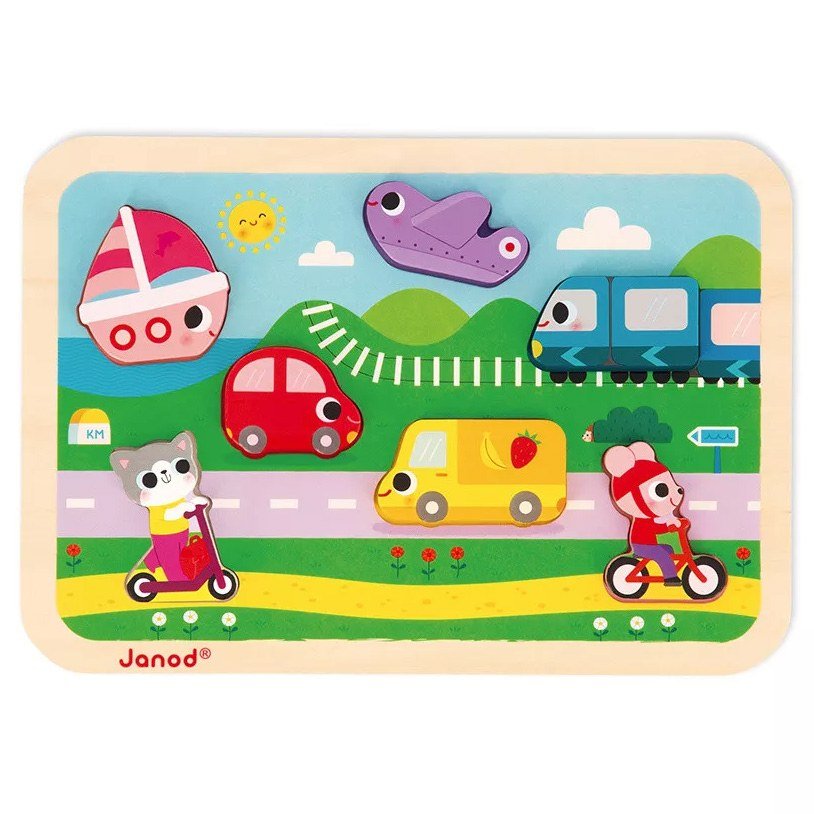 Βρουμ, βρουμ! Προσοχή το αυτοκίνητο! Συναρμολογήστε αυτό το χαριτωμένο βιβλίο με το τρένο, το αεροπλάνο και πολλά άλλα οχήματα που βρίσκονται στην καρδιά της πόλης. Τα συμπαγή κομμάτια Τα συμπαγή κομμάτια έχουν σχεδιαστεί έτσι ώστε να μπορούν να τα κρατάνε μικρά παιδικά χεράκια. Επιπλέον, τα παιδιά μπορούν είτε να τοποθετήσουν σωστά τα 7 κομμάτια στο ξύλινο ταμπλό είτε να τα χρησιμοποιήσουν ως φιγούρες. Αυτό το παζλ είναι ιδανικό για την ανάπτυξη λεπτών κινητικών δεξιοτήτων και την προώθηση της φαντασίας. Παζλ από ξύλο με χρώματα υδάτινης βάσης κατασκευασμένο με τις προδιαγραφές του Συμβουλίου Διαχείρισης των Δασών (FSCTM). Εκπαιδευτικό παιχνίδι πρώτης ηλικίας για παιδιά από 18 μηνών.