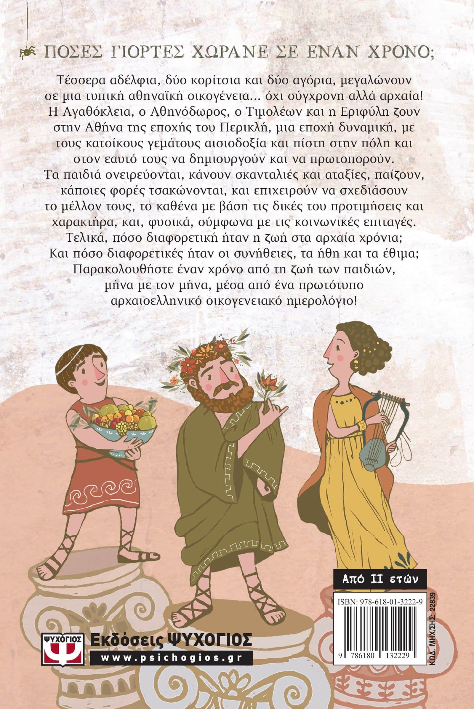 Πόσες γιορτές χωράνε σε έναν χρόνο;Τέσσερα αδέλφια, δύο κορίτσια και δύο αγόρια, μεγαλώνουν σε μια τυπική αθηναϊκή οικογένεια… όχι σύγχρονη αλλά αρχαία! Η Αγαθόκλεια, ο Αθηνόδωρος, ο Τιμολέων και η Εριφύλη ζουν στην Αθήνα της εποχής του Περικλή, μια εποχή δυναμική, με τους κατοίκους, γεμάτους αισιοδοξία και πίστη στην πόλη και στον εαυτό τους, να δημιουργούν και να πρωτοπορούν. Τα παιδιά ονειρεύονται, κάνουν σκανταλιές και αταξίες, παίζουν, κάποιες φορές τσακώνονται, και επιχειρούν να σχεδιάσουν το μέλλον τους, το καθένα με βάση τον δικό του χαρακτήρα, και, φυσικά, σύμφωνα με τις κοινωνικές επιταγές. Τελικά, πόσο διαφορετική ήταν η ζωή στα αρχαία χρόνια; Και πόσο διαφορετικές ήταν οι συνήθειες, τα ήθη και τα έθιμα; Παρακολουθήστε έναν χρόνο από τη ζωή των παιδιών, μήνα με τον μήνα, μέσα από ένα πρωτότυπο αρχαιοελληνικό οικογενειακό ημερολόγιο!