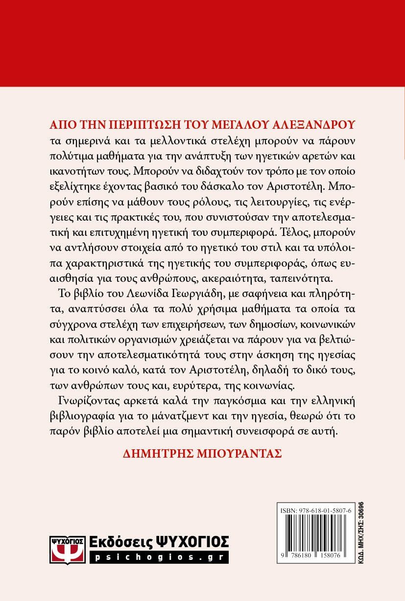 Από την περίπτωση του Μεγάλου Αλεξάνδρου τα σημερινά και τα μελλοντικά στελέχη μπορούν να πάρουν πολύτιμα μαθήματα για την ανάπτυξη των ηγετικών αρετών και ικανοτήτων τους. Μπορούν να διδαχτούν τον τρόπο με τον οποίο εξελίχτηκε έχοντας βασικό του δάσκαλο τον Αριστοτέλη. Μπορούν επίσης να μάθουν τους ρόλους, τις λειτουργίες, τις ενέργειες και τις πρακτικές του, που συνιστούσαν την αποτελεσματική και επιτυχημένη ηγετική του συμπεριφορά. Τέλος, μπορούν να αντλήσουν στοιχεία από το ηγετικό του στιλ και τα υπόλοιπα χαρακτηριστικά της ηγετικής του συμπεριφοράς, όπως ευαισθησία για τους ανθρώπους, ακεραιότητα, ταπεινότητα. Το βιβλίο του Λεωνίδα Γεωργιάδη, με σαφήνεια και πληρότητα, αναπτύσσει όλα τα πολύ χρήσιμα μαθήματα τα οποία τα σύγχρονα στελέχη των επιχειρήσεων, των δημοσίων, κοινωνικών και πολιτικών οργανισμών χρειάζεται να πάρουν για να βελτιώσουν την αποτελεσματικότητά τους στην άσκηση της ηγεσίας για το κοινό καλό, κατά τον Αριστοτέλη, δηλαδή το δικό τους, των ανθρώπων τους και, ευρύτερα, της κοινωνίας. Γνωρίζοντας αρκετά καλά την παγκόσμια και την ελληνική βιβλιογραφία για το μάνατζμεντ και την ηγεσία, θεωρώ ότι το παρόν βιβλίο αποτελεί μια σημαντική συνεισφορά σε αυτή.Δημήτρης Μπουραντάς