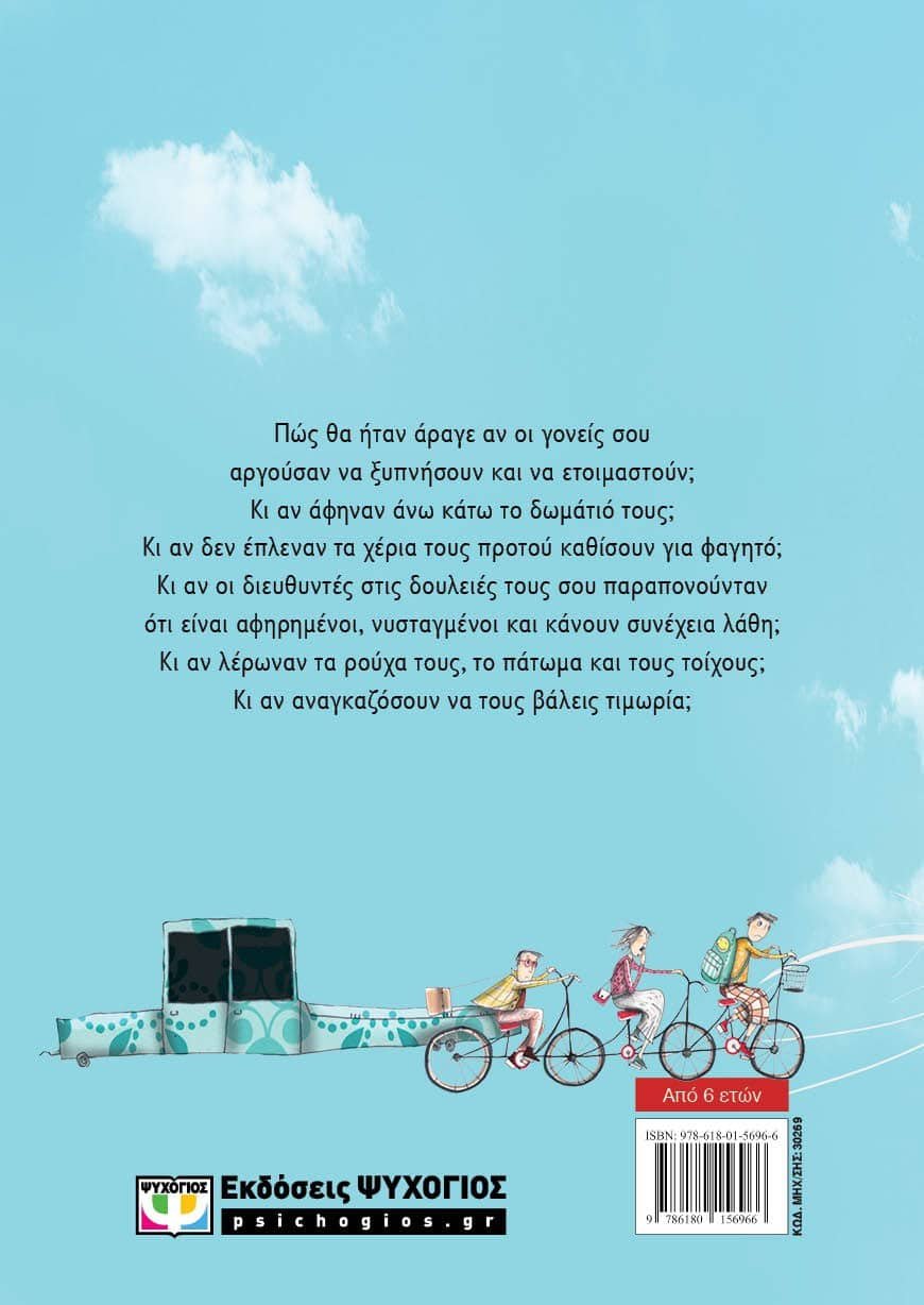 Πώς θα ήταν άραγε αν οι γονείς σου αργούσαν να ξυπνήσουν και να ετοιμαστούν; Κι αν άφηναν άνω κάτω το δωμάτιό τους;Κι αν δεν έπλεναν τα χέρια τους προτού καθίσουν για φαγητό; Κι αν οι διευθυντές στις δουλειές τους σου παραπονούνταν ότι είναι αφηρημένοι, νυσταγμένοι και κάνουν συνέχεια λάθη; Κι αν λέρωναν τα ρούχα τους, το πάτωμα και τους τοίχους; Κι αν αναγκαζόσουν να τους βάλεις τιμωρία; Διάβασε αυτό το πολύ διασκεδαστικό βιβλίο και θα καταλάβεις!