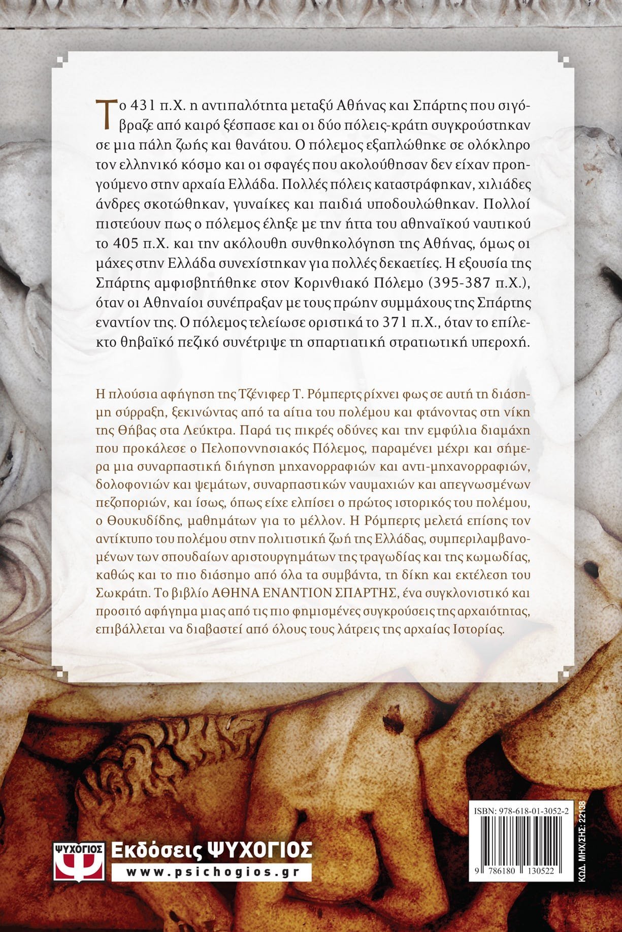 Το 431 π.Χ. η αντιπαλότητα μεταξύ Αθήνας και Σπάρτης που σιγόβραζε από καιρό ξέσπασε και οι δύο πόλεις-κράτη συγκρούστηκαν σε μια πάλη ζωής και θανάτου. Ο πόλεμος εξαπλώθηκε σε ολόκληρο τον ελληνικό κόσμο και οι σφαγές που ακολούθησαν δεν είχαν προηγούμενο στην αρχαία Ελλάδα. Πολλές πόλεις καταστράφηκαν, χιλιάδες άνδρες σκοτώθηκαν, γυναίκες και παιδιά υποδουλώθηκαν. Πολλοί πιστεύουν πως ο πόλεμος έληξε με την ήττα του αθηναϊκού ναυτικού το 405 π.Χ. και την ακόλουθη συνθηκολόγηση της Αθήνας, όμως οι μάχες στην Ελλάδα συνεχίστηκαν για πολλές δεκαετίες. Η εξουσία της Σπάρτης αμφισβητήθηκε στον Κορινθιακό Πόλεμο (395-387 π.Χ.), όταν οι Αθηναίοι συνέπραξαν με τους πρώην συμμάχους της Σπάρτης εναντίον της. Ο πόλεμος τελείωσε οριστικά το 371 π.Χ., όταν το επίλεκτο θηβαϊκό πεζικό συνέτριψε τη σπαρτιατική στρατιωτική υπεροχή.Η πλούσια αφήγηση της Τζένιφερ Τ. Ρόμπερτς ρίχνει φως σε αυτή τη διάσημη σύρραξη, ξεκινώντας από τα αίτια του πολέμου και φτάνοντας στη νίκη της Θήβας στα Λεύκτρα. Παρά τις πικρές οδύνες και την εμφύλια διαμάχη που προκάλεσε ο Πελοποννησιακός Πόλεμος, παραμένει μέχρι και σήμερα μια συναρπαστική διήγηση μηχανορραφιών και αντι-μηχανορραφιών, δολοφονιών και ψεμάτων, συναρπαστικών ναυμαχιών και απεγνωσμένων πεζοποριών, και, ίσως, όπως είχε ελπίσει ο πρώτος ιστορικός του πολέμου, ο Θουκυδίδης, μαθημάτων για το μέλλον. Η Ρόμπερτς μελετά επίσης τον αντίκτυπο του πολέμου στην πολιτιστική ζωή της Ελλάδας, συμπεριλαμβανομένων των σπουδαίων αριστουργημάτων της τραγωδίας και της κωμωδίας, καθώς και το πιο διάσημο από όλα τα συμβάντα, τη δίκη και εκτέλεση του Σωκράτη. Το βιβλίο ΑΘΗΝΑ ΕΝΑΝΤΙΟΝ ΣΠΑΡΤΗΣ, ένα συγκλονιστικό και προσιτό αφήγημα μιας από τις πιο φημισμένες συγκρούσεις της αρχαιότητας, επιβάλλεται να διαβαστεί από όλους τους λάτρεις της αρχαίας Ιστορίας.