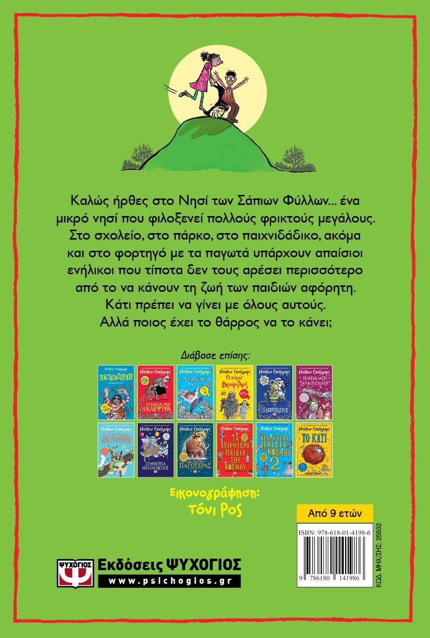 Καλώς ήρθες στο Νησί των Σάπιων Φύλλων… ένα μικρό νησί που φιλοξενεί πολλούς φρικτούς μεγάλους. Στο σχολείο, στο πάρκο, στο παιχνιδάδικο, ακόμα και στο φορτηγό με τα παγωτά υπάρχουν απαίσιοι ενήλικοι που τίποτα δεν τους αρέσει περισσότερο από το να κάνουν τη ζωή των παιδιών αφόρητη. Κάτι πρέπει να γίνει με όλους αυτούς. Αλλά ποιος έχει το θάρρος να το κάνει;