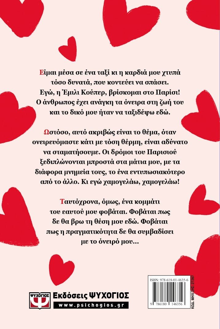 Είμαι μέσα σε ένα ταξί κι η καρδιά μου χτυπά τόσο δυνατά, που κοντεύει να σπάσει. Εγώ, η Έμιλι Κούπερ, βρίσκομαι στο Παρίσι! Ο άνθρωπος έχει ανάγκη τα όνειρα στη ζω ή του και το δικό μου ήταν να ταξιδέψω εδώ.Ωστόσο, αυτό ακριβώς είναι το θέμα, όταν ονειρευόμαστε κάτι με τόση θέρμη, είναι αδύνατο να σταματήσουμε. Οι δρόμοι του Παρισιού ξεδιπλώνονται μπροστά στα μάτια μου, με τα διάφορα μνημεία τους, το ένα εντυπωσιακότερο από το άλλο. Κι εγώ χαμογελάω, χαμογελάω!Ταυτόχρονα, όμως, ένα κομμάτι του εαυτού μου φοβάται. Φοβάται πως δε θα βρω τη θέση μου εδώ. Φοβάται πως η πραγματικότητα δε θα συμβαδίσει με το όνειρό μου…