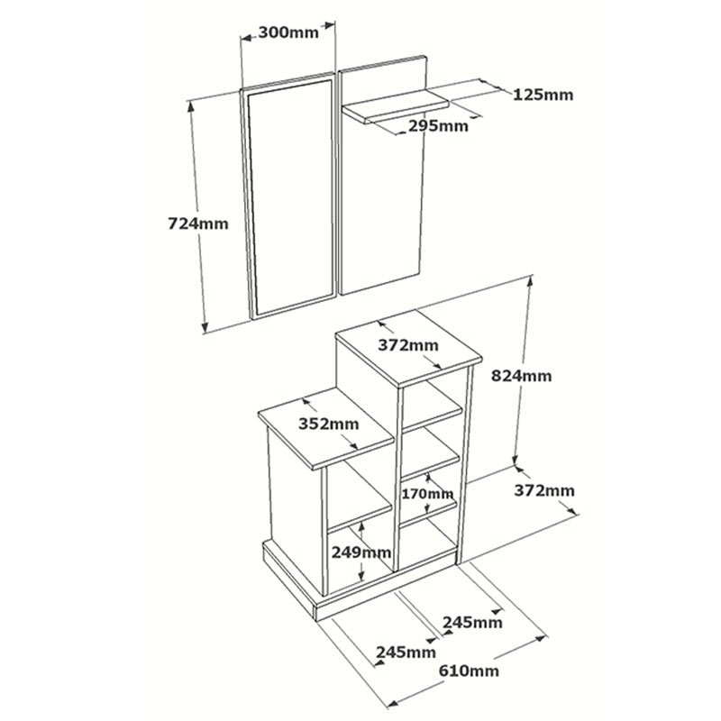 * Διαθέτει ντουλάπι με τέσσερα ράφια στο εσωτερικό του, δύο ράφια για ανοιχτή στήριξη και αποθήκευση παπουτσιών, αντικειμένων.