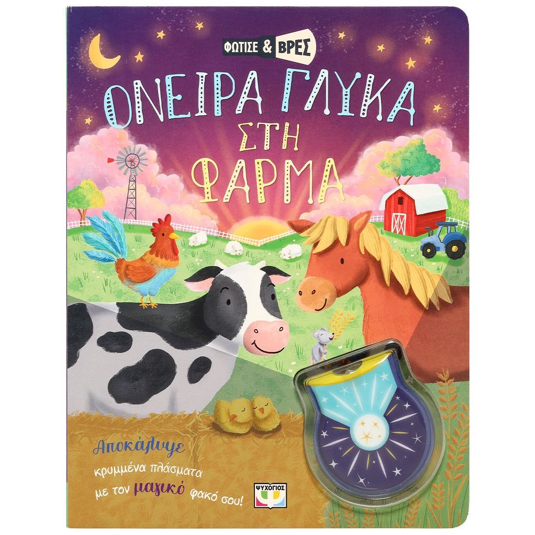 Η νύχτα απλώνεται στη φάρμα.Βοήθησε όλα τα ζωάκια να βρουν τα μικρά τους με τον μαγικό φακό σου και ευχήσου τους “όνειρα γλυκά”!Φώτισε τις σελίδες για να αποκαλύψεις πολύχρωμες κρυμμένες φιγούρες.