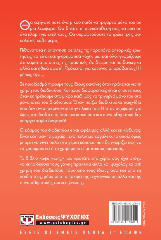 Θα αφήνατε ποτέ ένα μικρό παιδί να τριγυρνά μόνο του σε μια λεωφόρο; Θα δίνατε τη συγκατάθεσή σας να μπει σε ένα κλαμπ για ενηλίκους; Θα συμφωνούσατε να τρώει τρεις σοκολάτες κάθε μέρα; Πιθανότατα η απάντηση σε όλες τις παραπάνω ρητορικές ερωτήσεις να είναι κατηγορηματικά «όχι», μια και όλοι γνωρίζουμε ότι καμία από αυτές τις πρακτικές δε θεωρείται παιδαγωγικά αλλά και ηθικά σωστή. Πρόκειται για κανόνες απαράβατους! Ή μήπως όχι…;Σε ποιο βαθμό τηρούμε τους ίδιους κανόνες όταν πρόκειται για τηχρήση του διαδικτύου; Και πόσο διαφορετικές είναι οι συνέπειεςόταν επιτρέπουμε στο μικρό παιδί μας να τριγυρνά μόνο του στα μονοπάτια του διαδικτύου; Όταν παίζει διαδικτυακά παιχνίδια που δεν ανταποκρίνονται στην ηλικία του; Ή όταν σερφάρει για ώρες στο διαδίκτυο; Τόσο πρακτικά όσο και συναισθηματικά δεν υπάρχει καμία διαφορά!Ο κόσμος του διαδικτύου είναι ωφέλιμος αλλά και επικίνδυνος. Είναι κάτι σαν το μαχαίρι: ένα πολύτιμο εργαλείο, το οποίο όμως μπορεί να γίνει όπλο στα χέρια κάποιου που δε γνωρίζει πώς να το χρησιμοποιεί ή το χρησιμοποιεί με κακούς σκοπούς. Το βιβλίο «αφύπνισης» που κρατάτε στα χέρια σας έχει στόχο να εκπαιδεύσει τους γονείς πρακτικά αλλά και ψυχολογικά στη χρήση του διαδικτύου, τόσο από τους ίδιους όσο και από τα παιδιά τους, μέσα από το πρίσμα της τεχνογνωσίας αλλά και της συναισθηματικής αυτοεπίγνωσης.