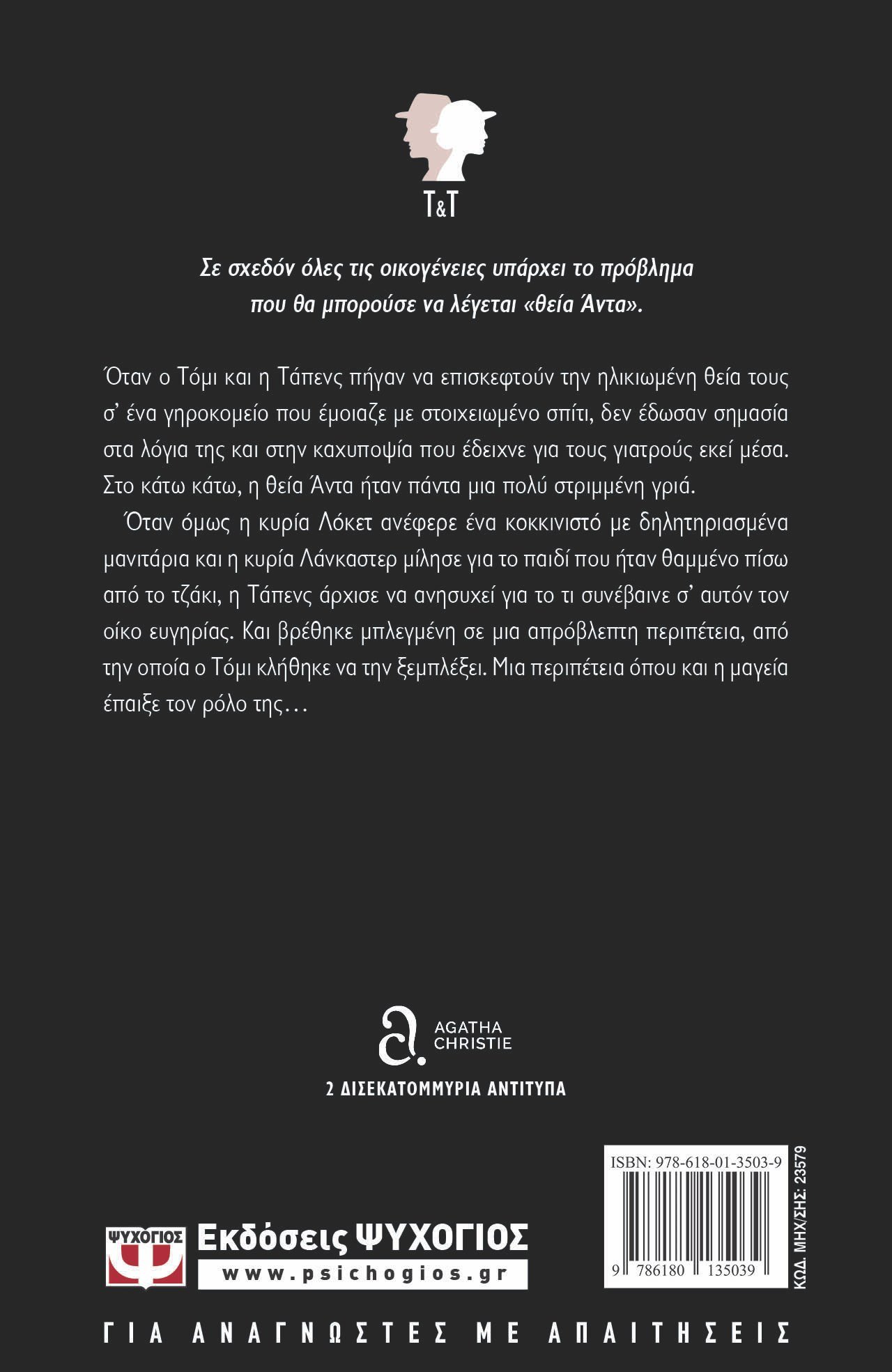 Σε σχεδόν όλες τις οικογένειες υπάρχει το πρόβλημα που θα μπορούσε να λέγεται «θεία Άντα».Όταν ο Τόμι και η Τάπενς πήγαν να επισκεφτούν την ηλικιωμένη θεία τους σ’ ένα γηροκομείο που έμοιαζε με στοιχειωμένο σπίτι, δεν έδωσαν σημασία στα λόγια της και στην καχυποψία που έδειχνε για τους γιατρούς εκεί μέσα. Στο κάτω κάτω, η θεία Άντα ήταν πάντα μια πολύ στριμμένη γριά. Όταν όμως η κυρία Λόκετ ανέφερε ένα κοκκινιστό με δηλητηριασμένα μανιτάρια και η κυρία Λάνκαστερ μίλησε για το παιδί που ήταν θαμμένο πίσω από το τζάκι, η Τάπενς άρχισε να ανησυχεί για το τι συνέβαινε σ’ αυτόν τον οίκο ευγηρίας. Και βρέθηκε μπλεγμένη σε μια απρόβλεπτη περιπέτεια, από την οποία ο Τόμι κλήθηκε να την ξεμπλέξει. Μια περιπέτεια όπου και η μαγεία έπαιξε τον ρόλο της…