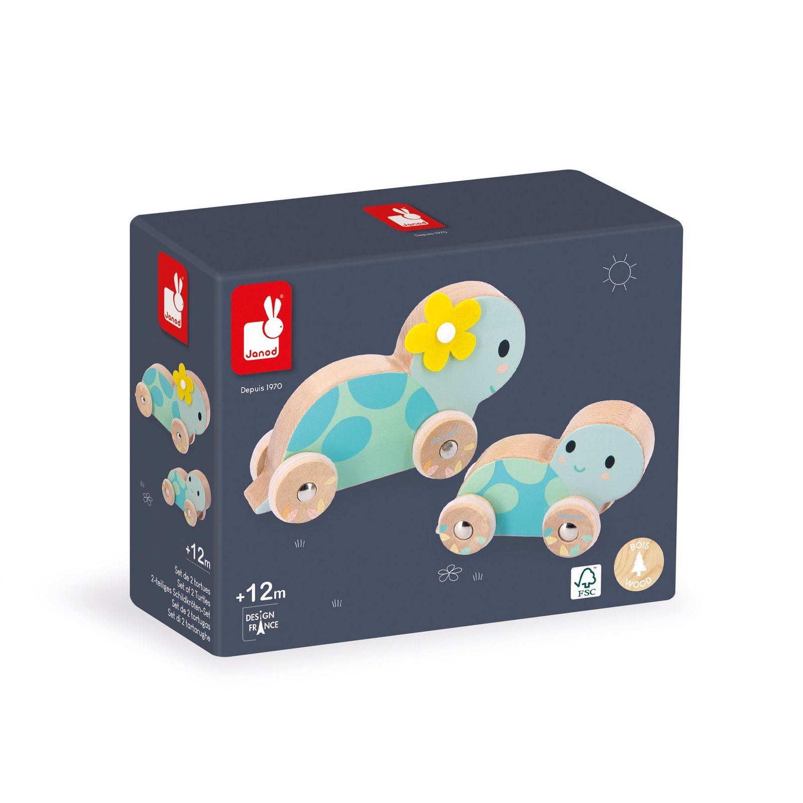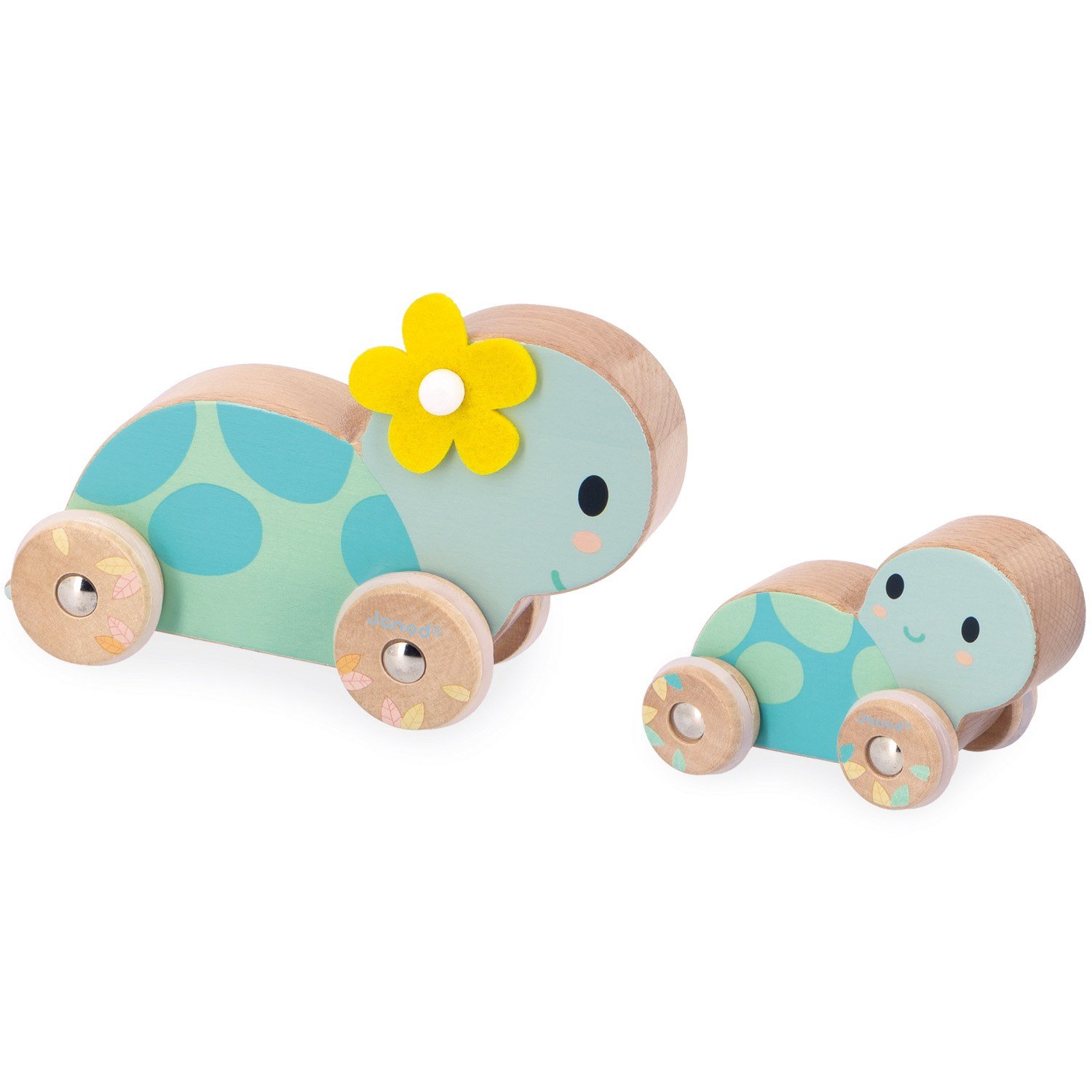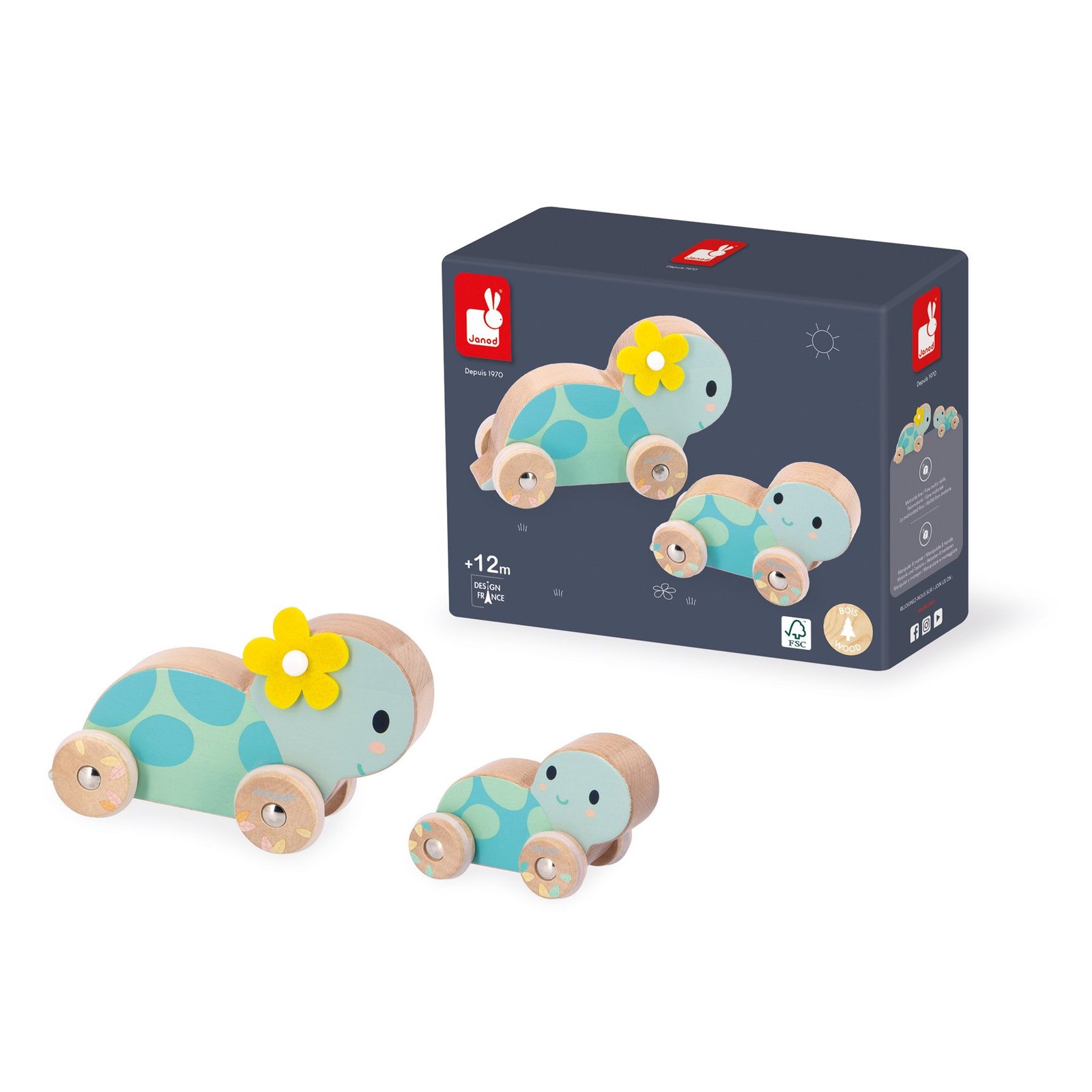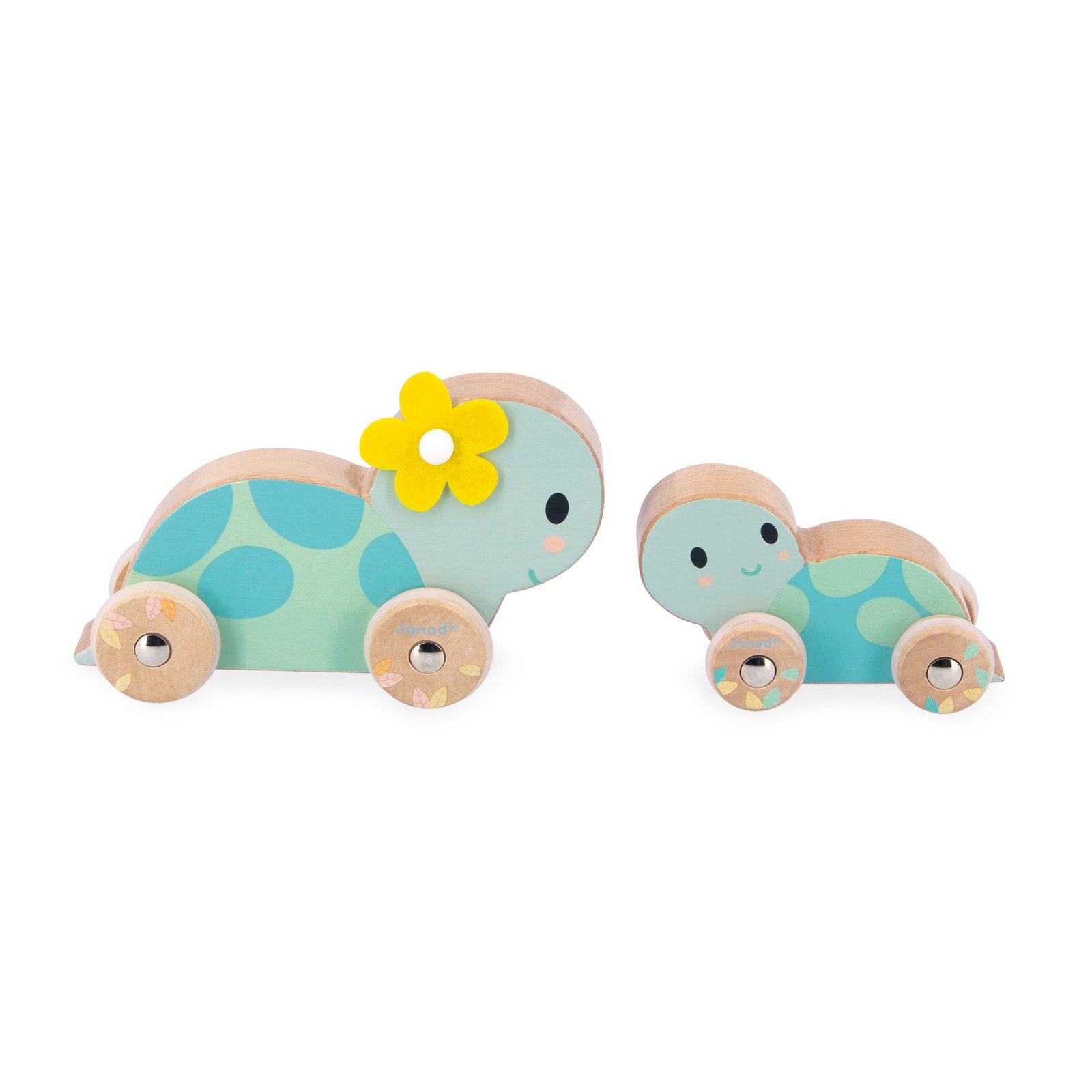 Ανακάλυψε το χαριτωμένο σετ με δύο χελώνες, μια γονέα και μια μωρό, που θα ενθουσιάσει τα παιδιά! Οι αθόρυβοι τροχοί από σιλικόνη εξασφαλίζουν ομαλή και αθόρυβη κίνηση, ενώ το λουλούδι από τσόχα στη μεγαλύτερη χελώνα προσθέτει μια αισθητική και παιχνιδιάρικη πινελιά. Ιδανικό παιχνίδι για να αναπτύξει τις λεπτές κινητικές δεξιότητες και να ενισχύσει τη φαντασία, προσφέροντας δημιουργικές ώρες διασκέδασης!