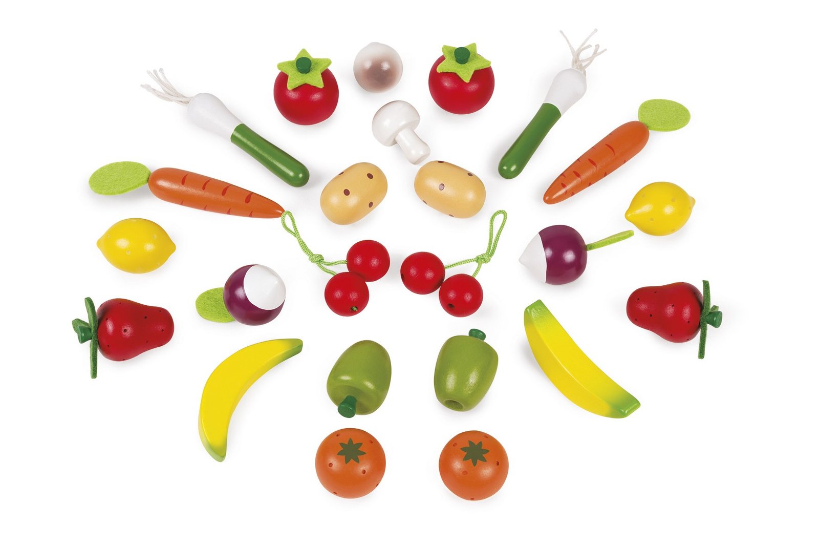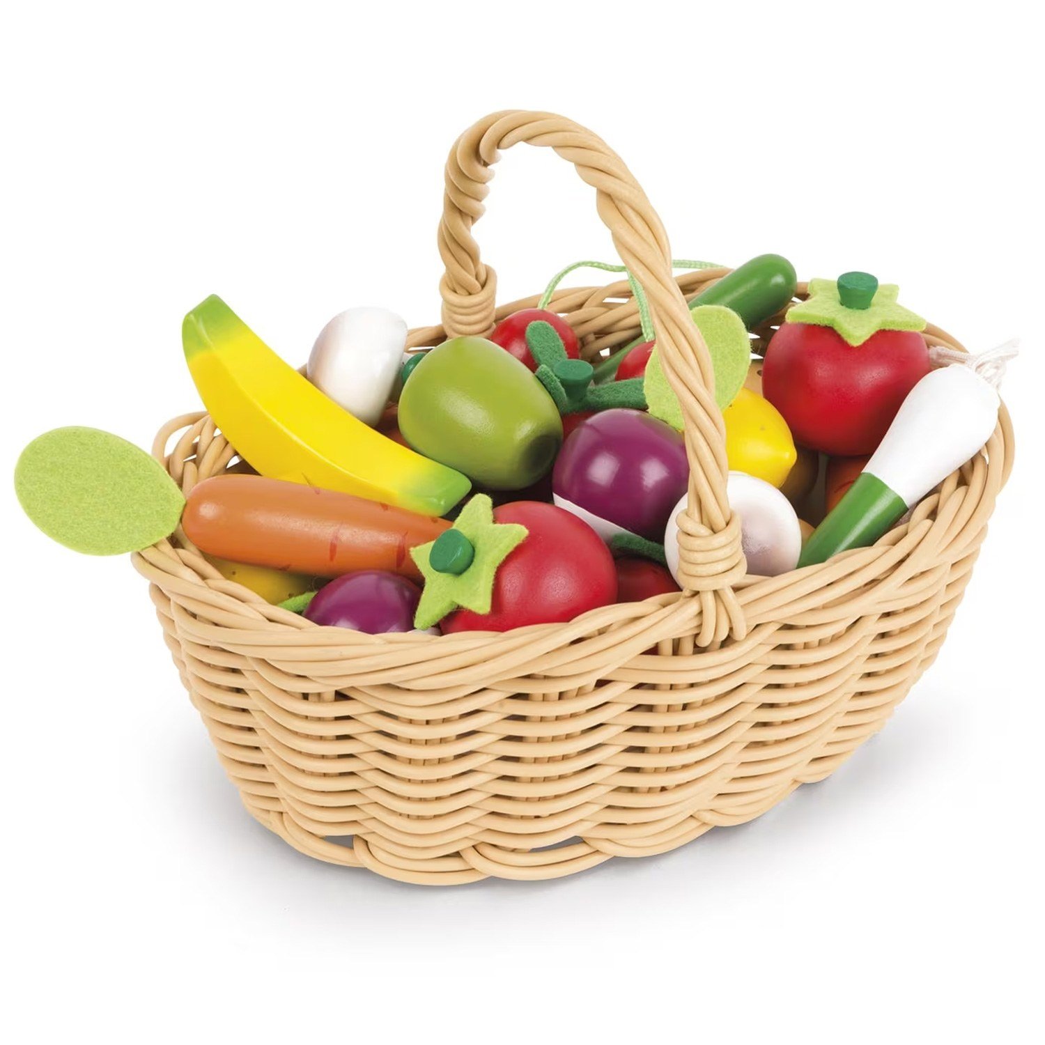 Παίξε τον μανάβη με αυτό το όμορφο (πλαστικό) καλάθι, γεμάτο με 24 φρούτα και λαχανικά (12 ποικιλίες). Τα φρούτα και τα λαχανικά είναι τυλιγμένα σε πλαστική θήκη και τοποθετημένα μέσα στο καλάθι, που περικλείεται σε πλαστικό φύλλο. Βασική βαφή. Συμπεριλαμβάνει: 2 λεμόνια (διάσταση 32 x 46 χιλ.), 2 πορτοκάλια (διάσταση 36 x 33 χιλ.), 2 μήλα (διάσταση 32 x 43 χιλ.), 2 μπανάνες (διάσταση 80 x 22 x 24 χιλ.), 2 φράουλες (διάσταση 33 x 50 χιλ.), 2 ζευγάρια κεράσια (διάσταση 24 χιλ. το κεράσι), 2 μανιτάρια (διάσταση 31 x 40 χιλ.), 2 καρότα (διάσταση 21 x 30 χιλ.), 2 ραπανάκια (διάσταση 34 x 63 χιλ.), 2 ντομάτες (διάσταση 40 x 41 χιλ.), 2 πράσα (διάσταση 21 x 94 χιλ.), 2 πατάτες (διάσταση 28 x 45 χιλ).