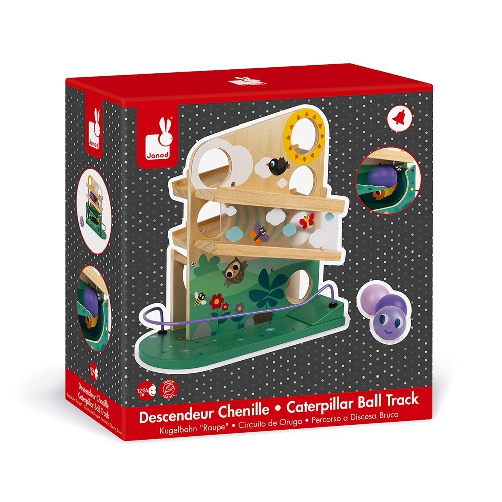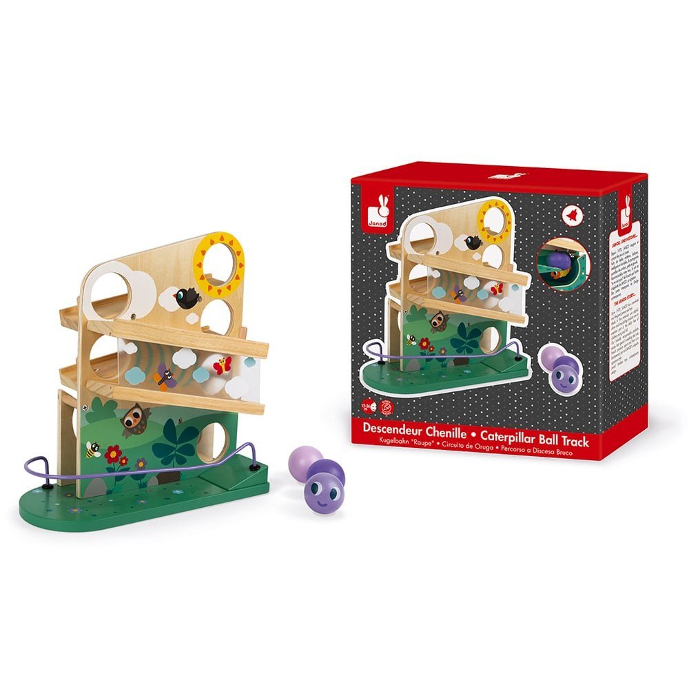 Οι 3 μπάλες περνούν μέσα από τον ήλιο και τα σύννεφα, έπειτα μέσα από το διαφανές τούνελ, μετά χτυπούν το κουδουνάκι και καταλήγουν στον κήπο σχηματίζοντας μια κάμπια. Τα παιδιά καλλιεργούν την οπτική τους οξύητητα, παρακολουθώντας τις μπάλες να κατρακυλούν. Ξύλο: Πεύκο. Εκτύπωση: Θερμοτυπία. Κλειστό κουτί.