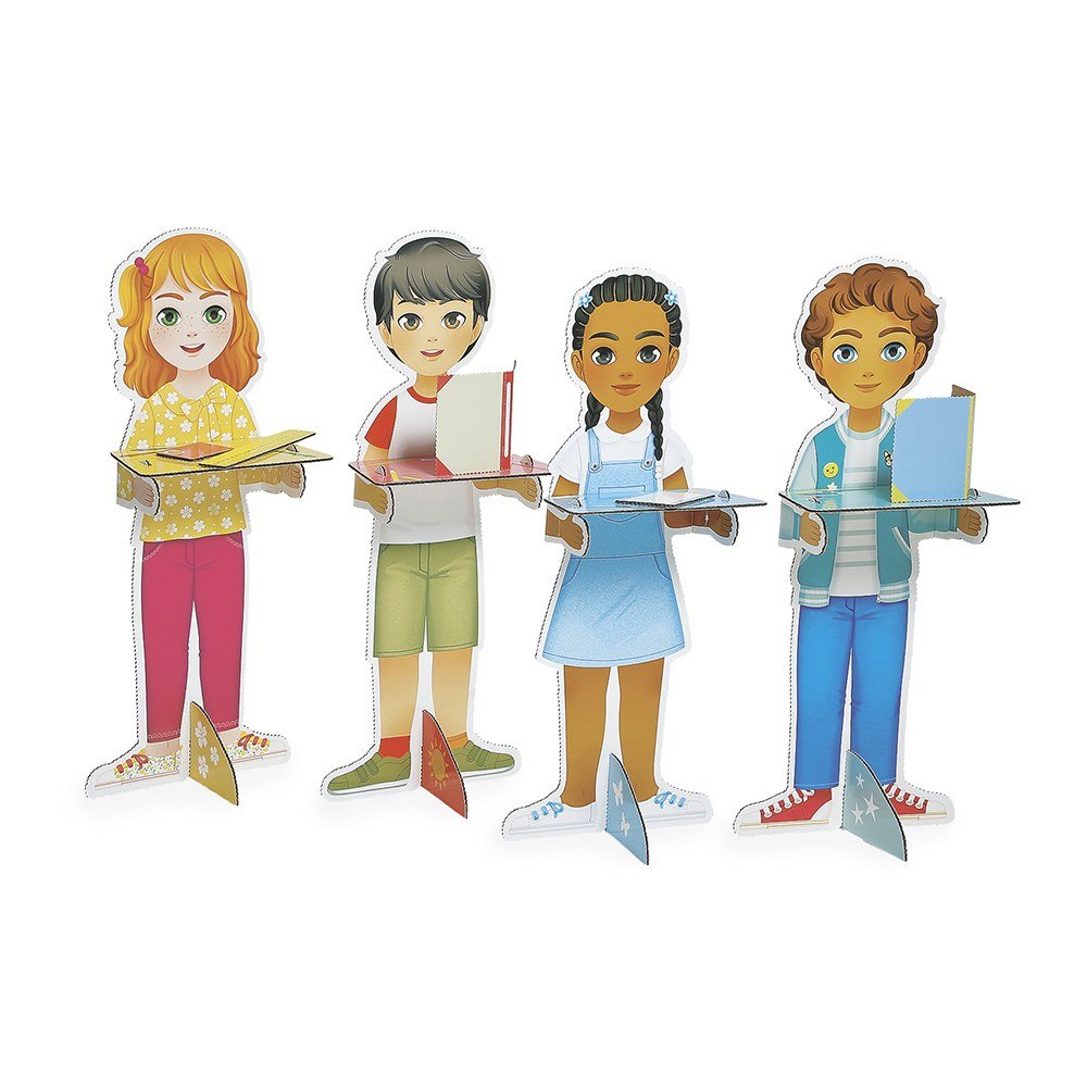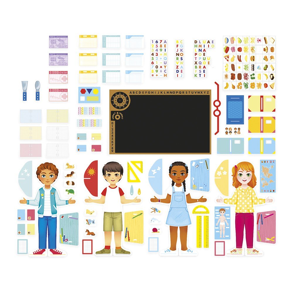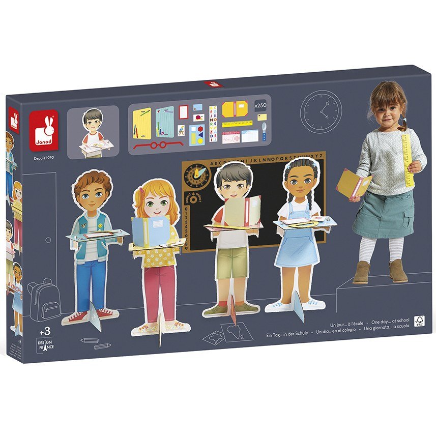 Σταματήστε την κουβέντα και πιάστε τα βιβλία των ασκήσεων! Δώστε την ευκαιρία στο μικρό σας να υποδυθεί τον ρόλο του αγαπημένου του δασκάλου, χάρη σ’ αυτό το εντυπωσιακό παιχνίδι με τους 4 χαρακτήρες που έχουν ύψος 65 εκ. Το παιδί σας θα έχει την ευκαιρία να αναπαραστήσει την αίθουσα της τάξης του με τη βοήθεια του μαυροπίνακα και των κιμωλιών, των μαθητών, που κάθονται στα θρανία τους –με τα σχολικά σύνεργα στο χέρι– έτοιμοι για τα μαθήματα γεωγραφίας, με τους χάρτες του κόσμου. Ακολουθεί η βιολογία, όπου οι μαθητές μπορούν να μάθουν για το ανθρώπινο σώμα και άλλα πράγματα, χάρη στο αλφαβητάρι και τις κάρτες με τα ζώα… Ααα, σαν να ακούσαμε το κουδούνι για διάλειμμα; Με μια κίνηση του χεριού, τα θρανία αναποδογυρίζουν και γίνονται δίσκοι της σχολικής τραπεζαρίας. Το παιδί σας θα έχει τη χαρά να σερβίρει τους συμμαθητές του με τον δίσκο σερβιρίσματος και τις 48 κάρτες φαγητού. Μόλις τελειώσει το μεσημεριανό, είναι ώρα για τα μαθηματικά: «Βγάλτε τους χάρακες και τα μοιρογνωμόνια!» Το σετ περιλαμβάνει ένα σύνολο από 250 αξεσουάρ για πολλές ώρες παιχνιδιού. Ιδανικό για την ανάπτυξη της φαντασίας και του μοιράσματος. Παιχνίδι μίμησης κατασκευασμένο από ξύλο και χαρτόνι, πιστοποιημένο από το Συμβούλιο Διαχείρισης των Δασών (FSCTM). Για παιδιά ηλικίας 3 ετών και άνω.
