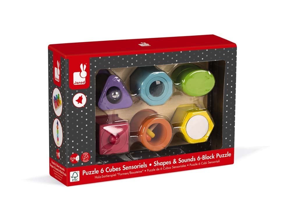Ένα φανταστικό παζλ για νήπια, που θα τους μάθει να αναγνωρίζουν τα σχήματα και θα τα βοηθήσει να αναπτύξουν τις λεπτές κινητικές τους δεξιότητες ενώ διασκεδάζουν. Κάθε κύβος έχει διαφορετικό σχήμα, χρώμα και λειτουργία: κουδούνι, καλειδοσκόπιο, εφέ ήχων, κόρνα, κουδουνίστρα και καθρέφτη. Αυτό το αισθητηριακό παζλ θα διεγείρει τις αισθήσεις του παιδιού σας. Βάση από κόντρα πλακέ, κύβοι από ξύλο οξιάς. Πιστοποίηση FSC. Βαφή νερού. Ανοιχτό κουτί με εσωτερική προστατευτική επένδυση PET.