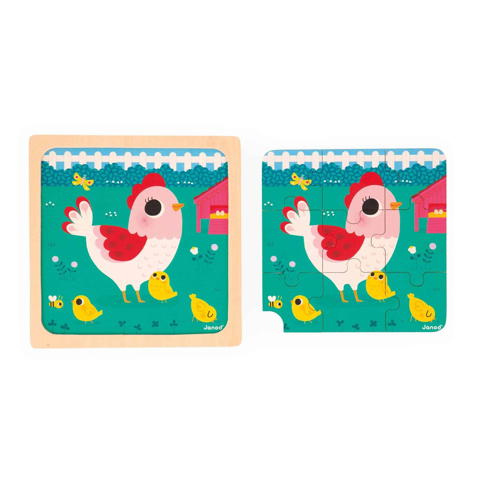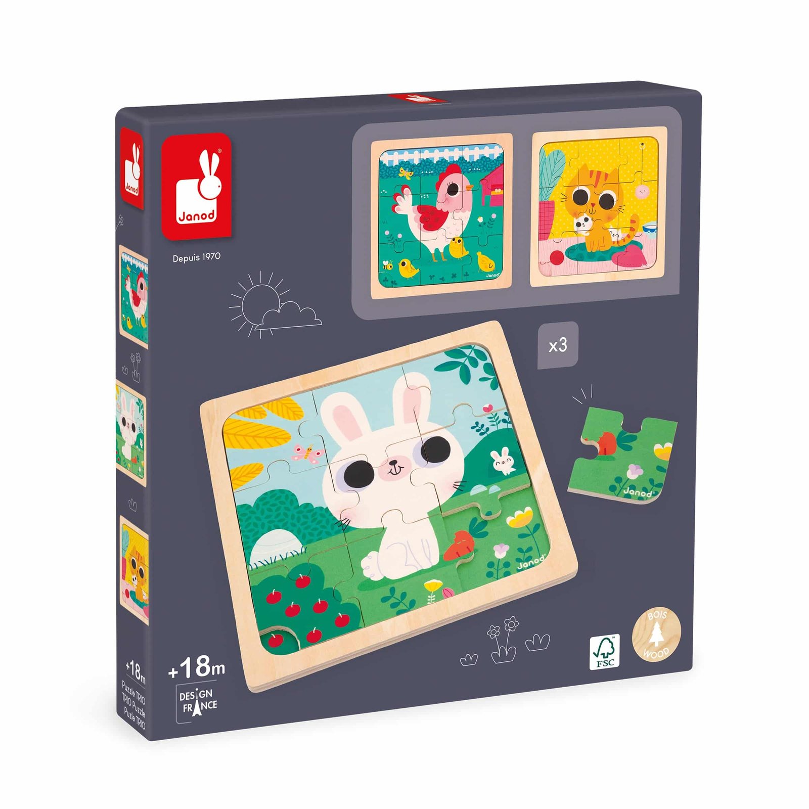 Η Henriette, η Peanut και το λευκό κουνέλι μέσα στο ίδιο κουτί! Σετ από 3 παζλ που περιλαμβάνουν την Peanut τη γατούλα, τη Henriette τη γλυκιά κοτούλα και το λευκό κουνέλι που μασουλάει καρότα. Κάθε παζλ περιλαμβάνει 9 ξύλινα κομμάτια και μια εσοχή για εύκολη αφαίρεση των κομματιών. Κάτω από κάθε παζλ υπάρχει ένα εκτυπωμένο μοντέλο, ιδανικό για να βοηθήσει τα μικρότερα παιδιά στη συναρμολόγηση. Τα εκτυπωμένα μοντέλα κάτω από το παζλ βοηθούν τα μικρότερα παιδιά στη συναρμολόγηση. Αυτό το παιχνιδιάρικο σετ θα βοηθήσει το παιδί σας να αναπτύξει τις λεπτές κινητικές δεξιότητες, τη συγκέντρωση αλλά και την ανεξαρτησία του. Παιχνίδι για τα πρώτα χρόνια του παιδιού, κατασκευασμένο από τσόχα και ξύλο πιστοποιημένο από το Συμβούλιο Διαχείρισης των Δασών (FSCTM), κατάλληλο για παιδιά ηλικίας από 18 μηνών και άνω.