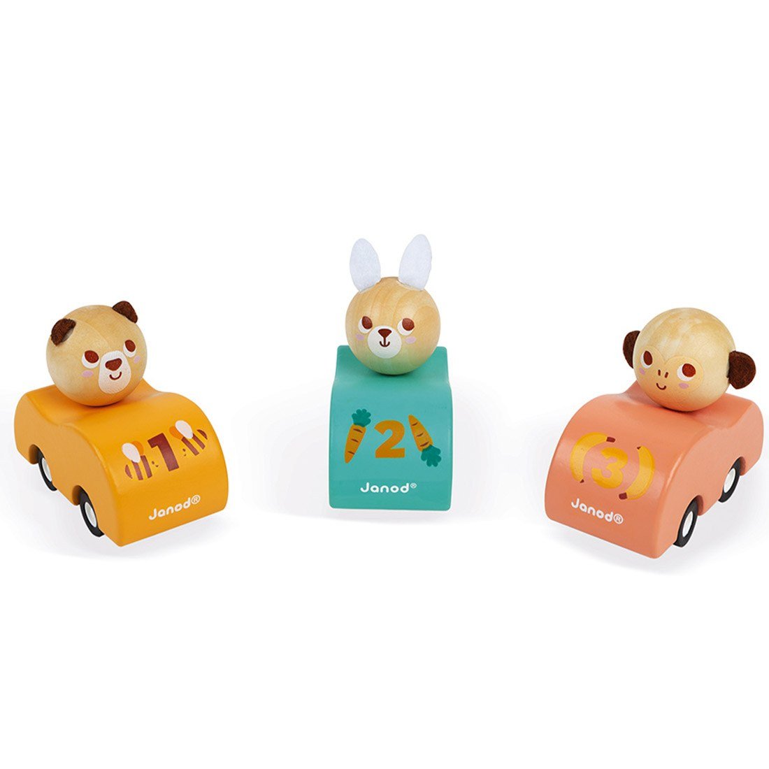 Συλλογή από 15 αυτοκινητάκια: 5 τεμάχια από το κάθε ζωάκι (αρκούδα, κουνέλι, μαϊμού). Απλώς σπρώξτε το αυτοκινητάκι πίσω και αφήστε το να οδηγήσει μόνο του σαν ένα πραγματικό αγωνιστικό αμάξι. Τα αυτιά των ζώων είναι φτιαγμένα από τσόχα. Στο κάλυμμα κάθε αυτοκινήτου είναι τυπωμένος ένας αριθμός κι ένα διαφορετικό σχέδιο που σχετίζεται με το ζωάκι (π.χ. καρότα για το κουνέλι, μέλισσες για την αρκούδα και μπανάνες για τη μαϊμού). Πωλείται όπως εικονίζεται με ένα ταμπελάκι σε κάθε τεμάχιο. Ξύλο πιστοποιημένο από το Συμβούλιο Διαχείρισης των Δασών (FSCTM).Σημείωση: Το προϊόν διατίθεται σε διάφορα σχέδια/χρώματα και η αποστολή γίνεται με τυχαία επιλογή. Η συσκευασία περιλαμβάνει 1 τεμάχιο.