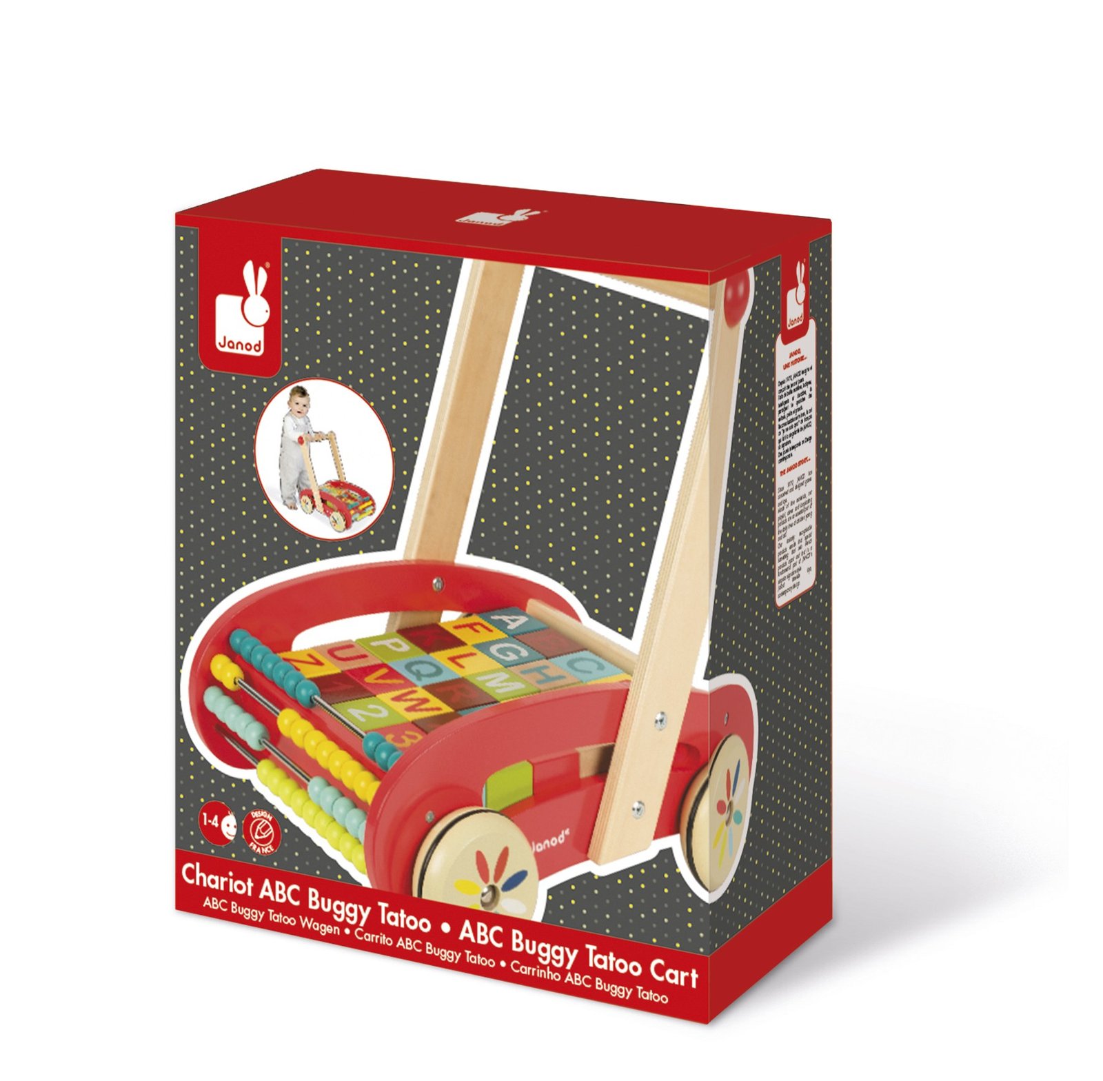 Για τα πρώτα βήματα του μωρού σας, 30 κύβοι με γράμματα της αλφαβήτου (κεφαλαία και πεζά γράμματα) και αριθμούς. Ένας άβακας για να μάθει να μετράει παίζοντας. Κύβοι από ξύλο πεύκου (διαστάσεις 45 x 45 x 45 χιλ.). Τροχοί και χερούλι από MDF και πλαϊνά από κόντρα πλακέ. Τα σχέδια στους κύβους έχουν εκτύπωση μεταξοτυπίας. Κλειστό χρωματιστό κουτί.