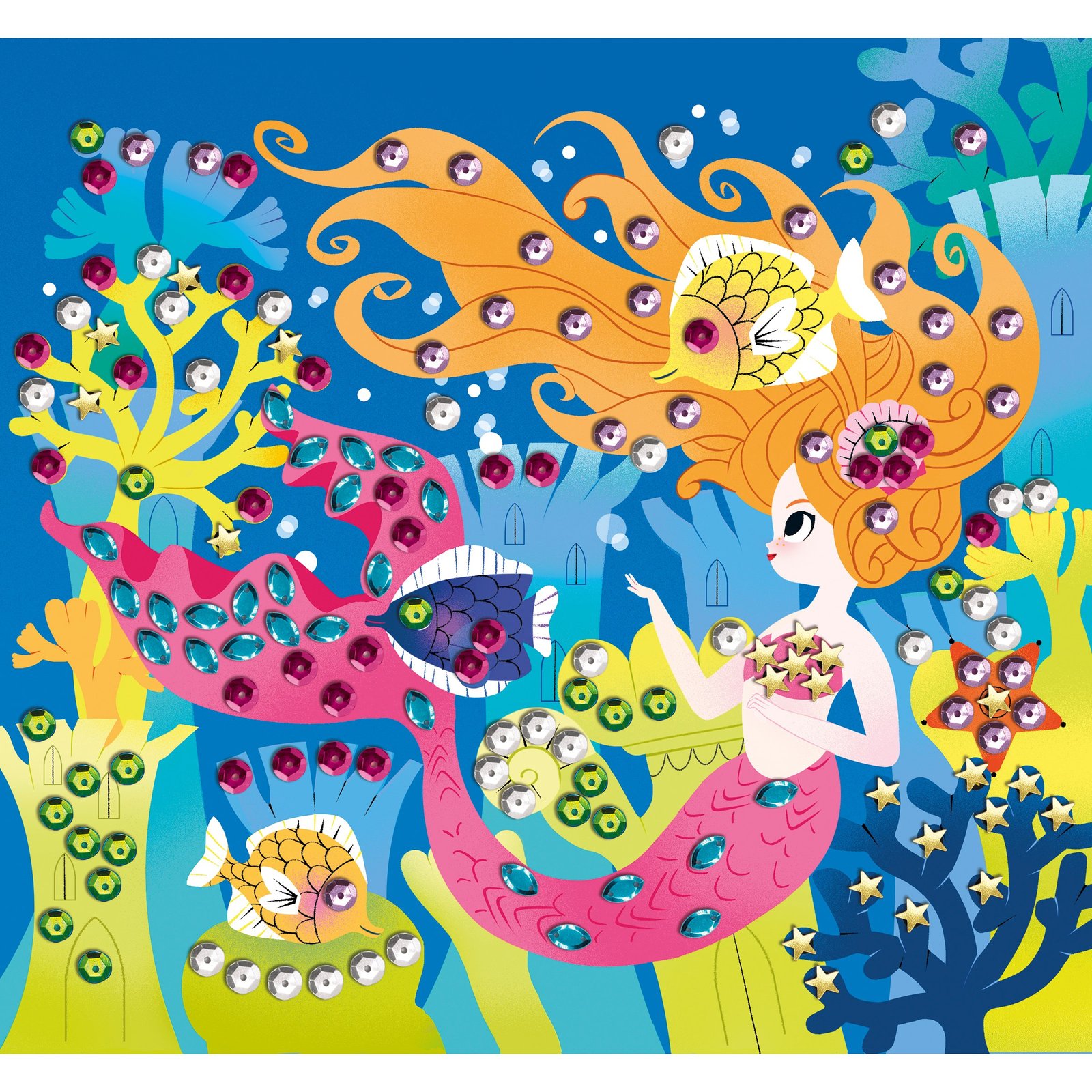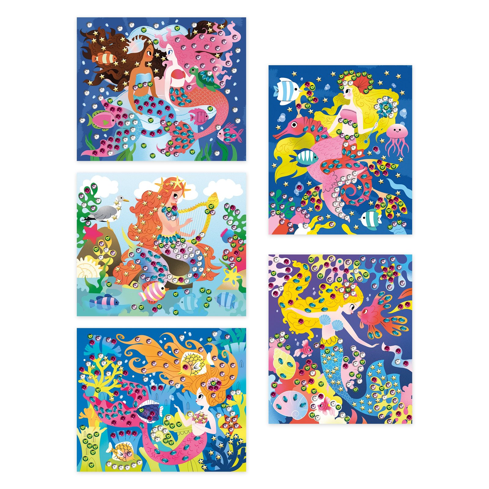 Βουτήξτε στα βάθη του ωκεανού ψάχνοντας για γοργόνες! Συνολικά 5 εικόνες και 800 πούλιες σε διάφορα σχήματα και χρώματα συμπληρώνουν το σετ. Εσείς απλώς ξεκολλήστε τις αυτοκόλλητες περιοχές και εφαρμόστε τις πούλιες για να διακοσμήσετε τις γοργόνες, με τη βοήθεια των οδηγιών. Θα χρειαστείτε 3 ώρες για να ολοκληρώσετε τις 5 εικόνες. Με αυτή τη δραστηριότητα, το παιδί αναπτύσσει τη δεξιοτεχνία και τη συγκέντρωση. Ιδανική για παιδιά ηλικίας 6 ετών και άνω.