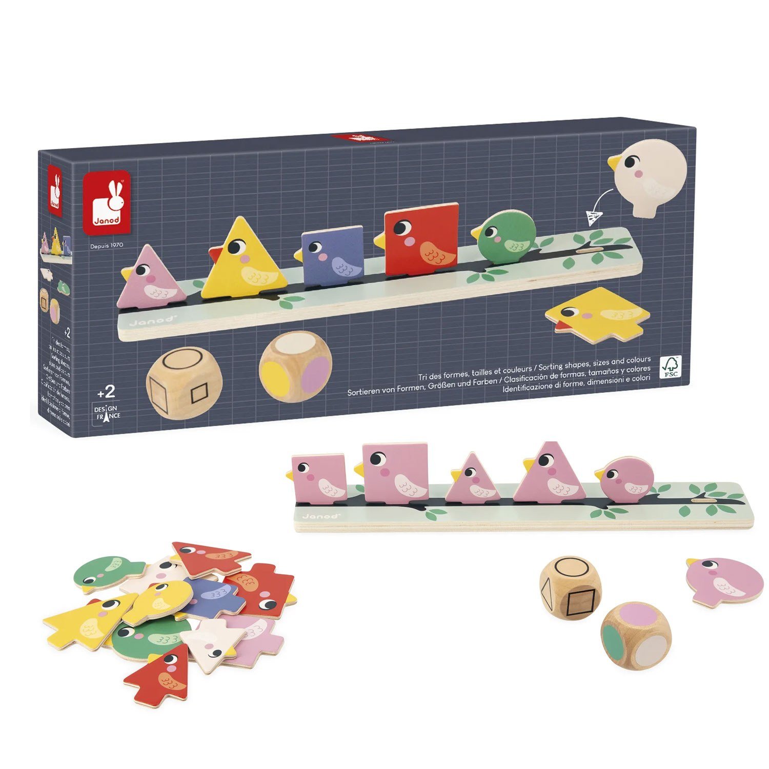 Ήρθε η άνοιξη! Πουλιά σε κάθε σχήμα, χρώμα και μέγεθος κουρνιάζουν στα δέντρα. Βοηθήστε τα να βρουν τη θέση τους πάνω στο κλαδί. Αυτό το εκπαιδευτικό παιχνίδι βοηθά το παιδί σας να μάθει να ξεχωρίζει διαφορετικά στοιχεία ανάλογα με το χρώμα, το σχήμα ή το μέγεθος. Περιλαμβάνει 2 κλαδιά, 72 ξύλινα πουλιά και 2 ζάρια (1 με χρώματα και 1 με διάφορα σχήματα και μεγέθη). Παίζεται με 1 ή περισσότερους παίκτες και είναι ιδανικό για να συνδυάσετε την εκμάθηση με τη διασκέδαση. Παίζεται με δύο τρόπους: ως «ανεξάρτητο εργαστήριο» και ως «εργαστήριο για δύο». Έτσι, μπορείτε να συνοδεύσετε το παιδί σας στην πορεία εκμάθησής του ή να το αφήσετε να τοποθετήσει τα πουλιά πάνω στο κλαδί ανάλογα με το αποτέλεσμα που δείχνουν τα ζάρια. Επίσης, μπορεί να παιχτεί από 2 παιδιά ταυτόχρονα. Παιχνίδι κατασκευασμένο από ξύλο πιστοποιημένο από το Συμβούλιο Διαχείρισης των Δασών (FSCTM). Εκπαιδευτικό παιχνίδι που αναπτύχθηκε σε συνεργασία με δάσκαλο, ιδανικό για παιδιά ηλικίας 2 ετών.