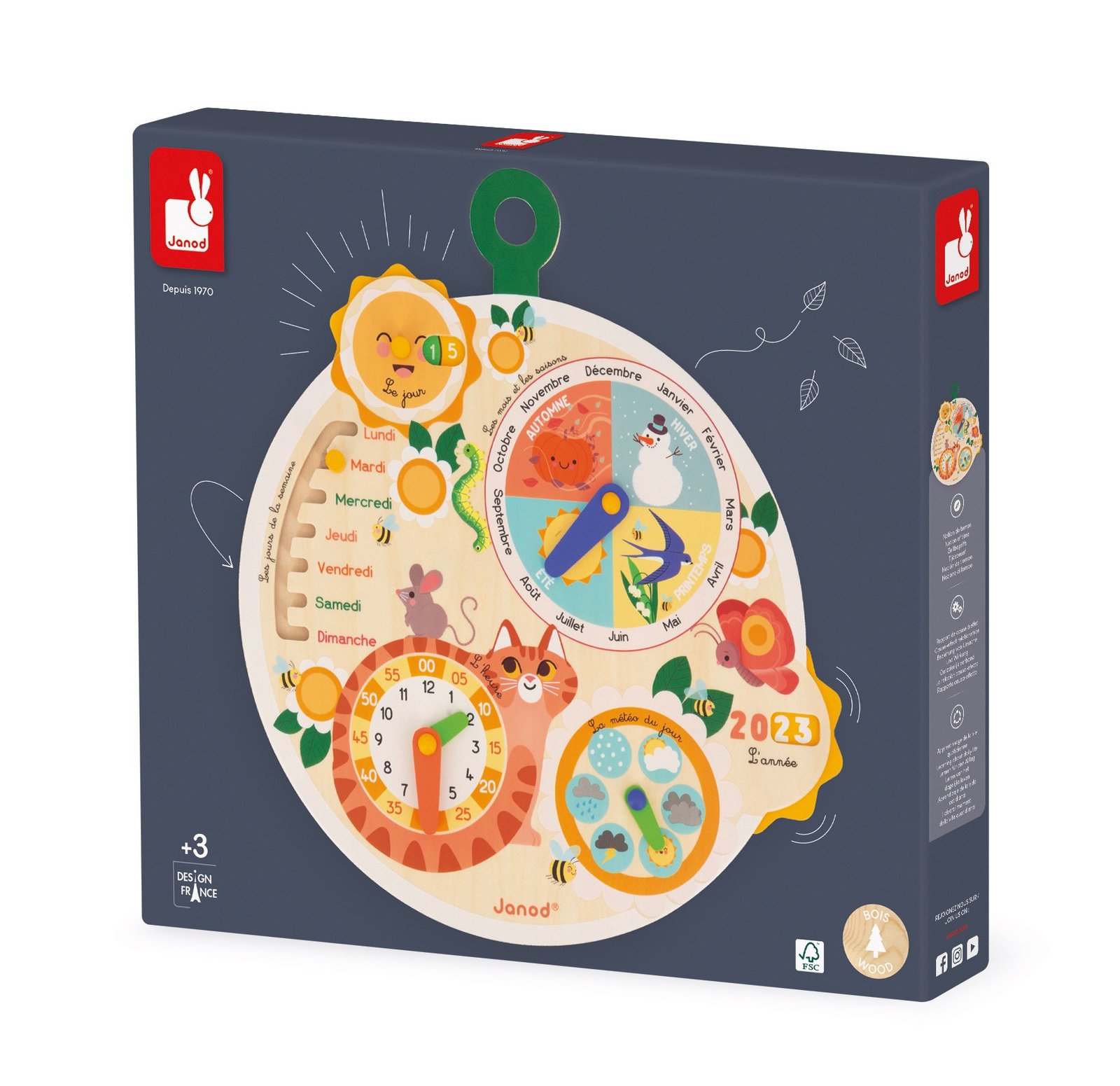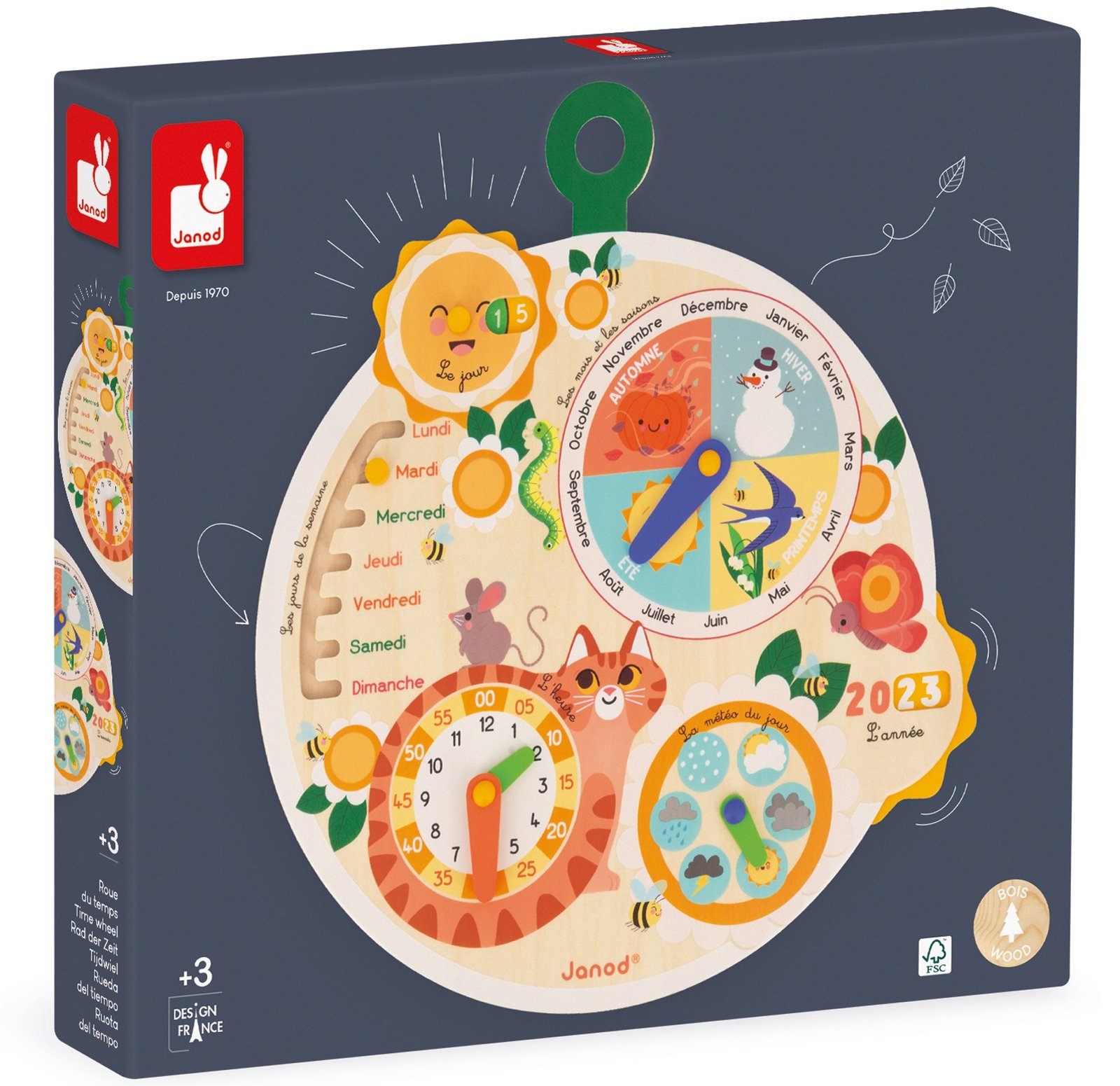 ΤΙΚ, ΤΟΚ… Ο χρόνος είναι μια έννοια δύσκολη στην εκμάθηση. Όμως, χάρη σε αυτό το παιχνίδι, το παιδί σας θα μάθει να διαχειρίζεται μόνο του τον χρόνο και στον δικό του ρυθμό. Ένας ήλιος γυρίζει για να δείξει την ημερομηνία, ένα βελάκι-δρομέας βοηθά το παιδί σας να μάθει τις μέρες της εβδομάδας, ένα ρολόι με 2 χρωματισμούς δείκτες το μαθαίνει να διακρίνει τις ώρες από τα λεπτά, ένας δείκτης του καιρού το μαθαίνει να ντύνεται μόνο του και, τέλος, ένας άλλος δείκτης το βοηθά να κατανοήσει τις εποχές και τους μήνες. Ο τροχός του χρόνου έχει κι έναν μικρότερο τροχό, που διατρέχει τα χρόνια για ένα διάστημα 10 ετών: 5 χρόνια στη μία πλευρά και 5 στην άλλη. Ο τροχός μπορεί να κρεμαστεί στον τοίχο. Ξύλινο παιχνίδι για τα πρώτα χρόνια του παιδιού, για παιδιά ηλικίας από 3 ετών και άνω. Παιχνίδι κατασκευασμένο από ξύλο πιστοποιημένο από το Συμβούλιο Διαχείρισης των Δασών (FSCTM).