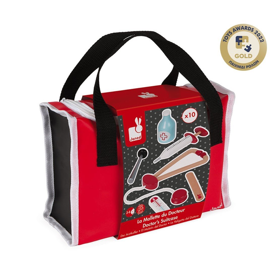 10 εξαρτήματα: μια σύριγγα με έμβολο, ένα σφυράκι αντανακλαστικών, ένα μπουκάλι απολυμαντικό, ένα στηθοσκόπιο, ένα ωτοσκόπιο εξοπλισμένο με μεγεθυντικό φακό, ένα θερμόμετρο, ένα γλωσσοπιέστρο, ένα μπλοκ συνταγών (30 σελίδες) με μολύβι και ένα ρολό γάζα. Εξαρτήματα από συμπαγές ξύλο. Βαλίτσα από ματ PVC. Πωλείται σε μια όμορφη κόκκινη και μπλε βαλίτσα με μεταλλικό φερμουάρ και 2 υφασμάτινες λαβές. Εκτύπωση των εξαρτημάτων: μεταξοτυπία. Εσωτερική θήκη από χοντρό χαρτόνι με λαβή στερεωμένη γύρω από τη βαλίτσα με πλαστική θήκη για την προστασία του προϊόντος κατά τη μεταφορά.