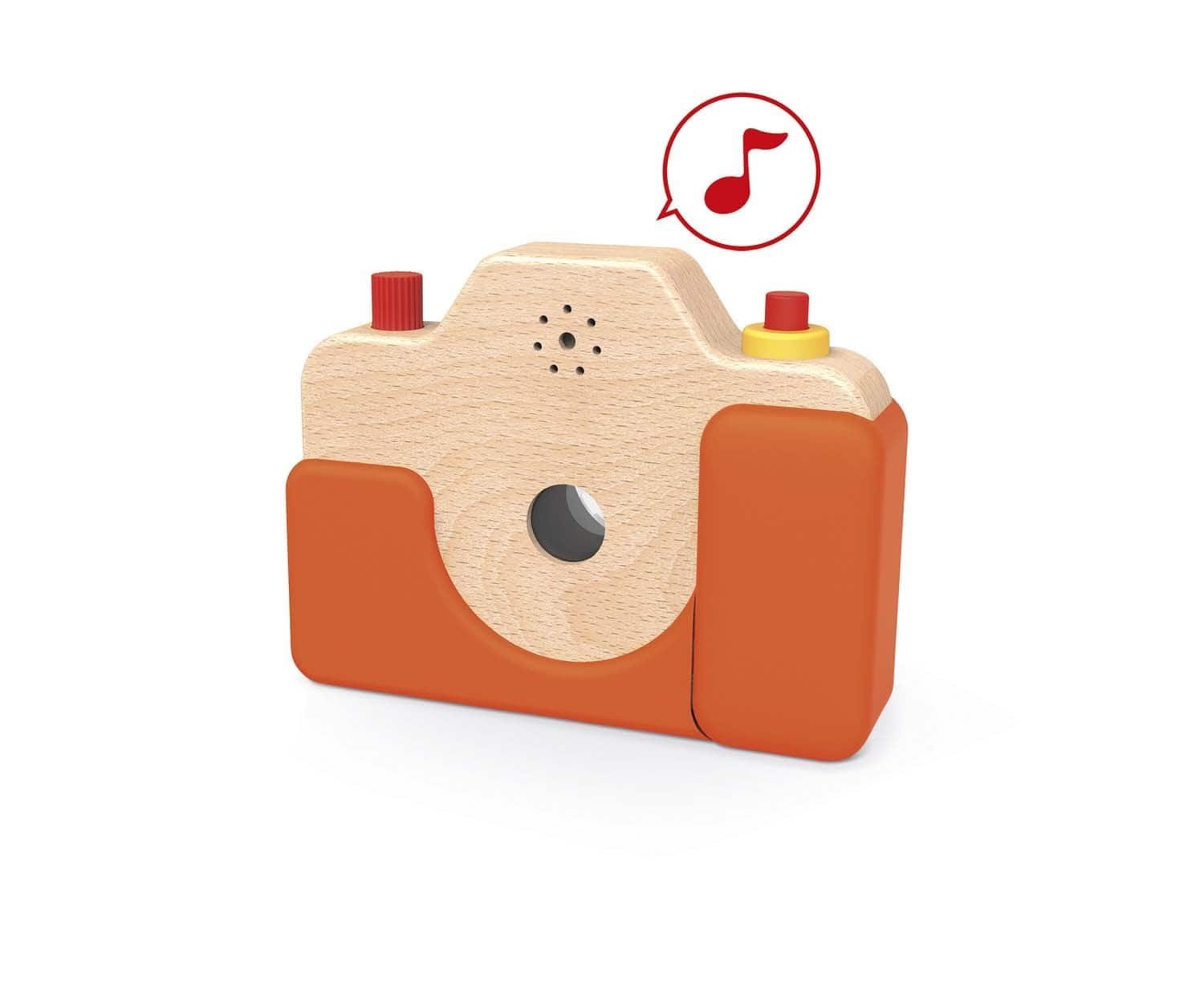 Μια φωτογραφική μηχανή ίδια με των μεγάλων! Φωτογραφική μηχανή με ήχους, φτιαγμένη από ξύλο οξιάς. Διαθέτει καλειδοσκόπιο και κουμπί λήψης, που βγάζει τον ίδιο ήχο με τη φωτογραφική μηχανή. Τη μηχανή προστατεύει θήκη από σιλικόνη. Κουτί με αυτοκόλλητο ασφαλείας. Συνοδεύεται από 3 μπαταρίες 1.5V.