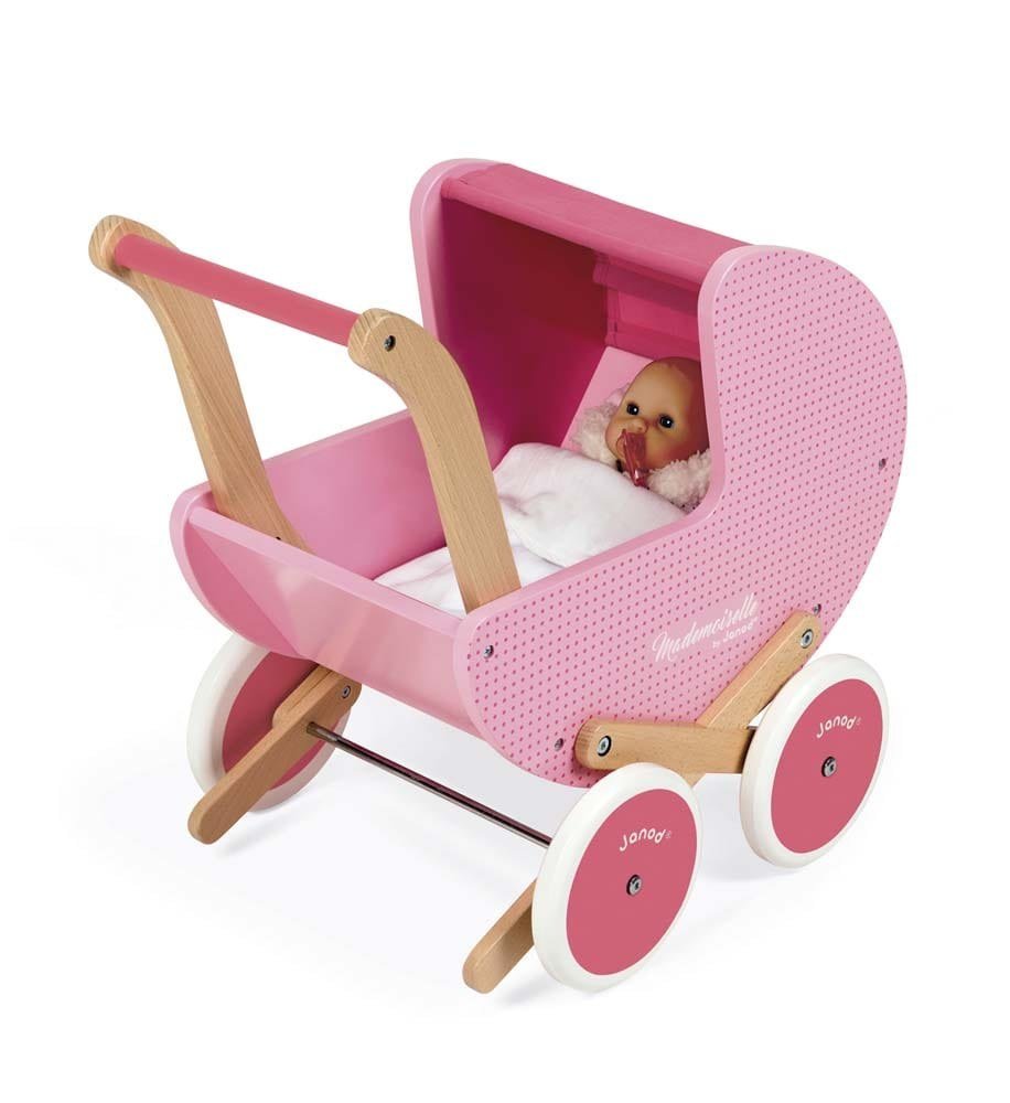 Ένα ρεαλιστικό αντίγραφο ενός ρετρό καροτσιού! Τα μικρά κορίτσια απολαμβάνουν τον ρόλο της «μαμάς», πηγαίνοντας βόλτα τις κούκλες τους με το καρότσι. Συνοδεύεται από μια μαλακή κουβέρτα για να σκεπάζονται οι κουκλίτσες. Οι τροχοί από καουτσούκ είναι αθόρυβοι και δεν αφήνουν σημάδια στο πάτωμα. Οι άξονες των τροχών είναι κατασκευασμένοι από μέταλλο. Επίσης, το καρότσι είναι εξοπλισμένο με ένα ειδικό σύστημα ασφάλειας, το οποίο μπορεί να αφαιρεθεί όταν το παιδί μάθει να περπατά. Κατάλληλο για άνω των 18 μηνών.