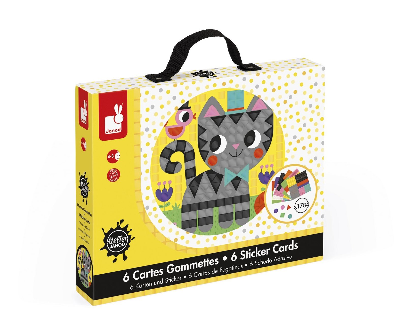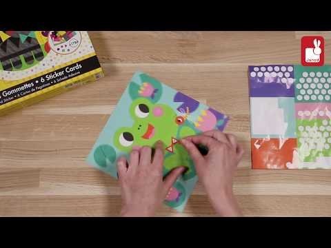 Κουτί με 6 κάρτες και 6 φύλλα με αυτοκόλλητα με θέμα τα ζώα: γάτα, σκύλος, βάτραχος, λαγός, χελώνα και κοτόπουλο. Κάθε κάρτα έχει χρωματιστά κουτιά και σχήματα διαφορετικού χρώματος, όπου τα παιδιά πρέπει να κολλήσουν το σωστό αυτοκόλλητο για να σχηματιστεί η εικόνα. Διαστάσεις καρτών: 20 x 20 εκ. 1.784 αυτοκόλλητα συνολικά, μοιρασμένα σε 6 φύλλα. Συμπεριλαμβάνεται φυλλάδιο οδηγιών (μεταφρασμένο στα αγγλικά, στα γερμανικά, στα ολλανδικά, στα ισπανικά, στα ιταλικά και στα ρωσικά). Πωλείται σε βαλιτσάκι από σκληρό χαρτόνι με πλήρη εκτύπωση και υφασμάτινη λαβή. Εσωτερική στρώση αφρού για βέλτιστη προστασία. 2 διάφανα στρογγυλά αυτοκόλλητα εξασφαλίζουν το καλό κλείσιμο του κουτιού. Προστατευτική πλαστική θήκη για τη μεταφορά.