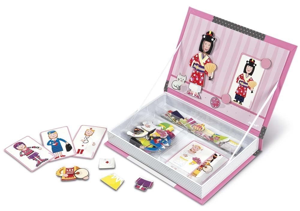 Μαγνητικός πίνακας, σε σχήμα βιβλίου, με θέμα κοριτσίστικες στολές. Σκοπός είναι να δημιουργήσουμε διάφορα κοστούμια από επαγγέλματα, όπως νοσοκόμα, αεροσυνοδός κ.ά, ή να φτιάξουμε νέες στολές αναμειγνύοντας τους μαγνήτες. Το σετ περιλαμβάνει 34 μαγνήτες και 8 μαγνητικές κάρτες. Τα μαγνητικά παζλ είναι παιχνίδια που αναπτύσσουν τη δημιουργικότητα και τη φαντασία των παιδιών. Κατάλληλο για ηλικίες από 3 ετών.