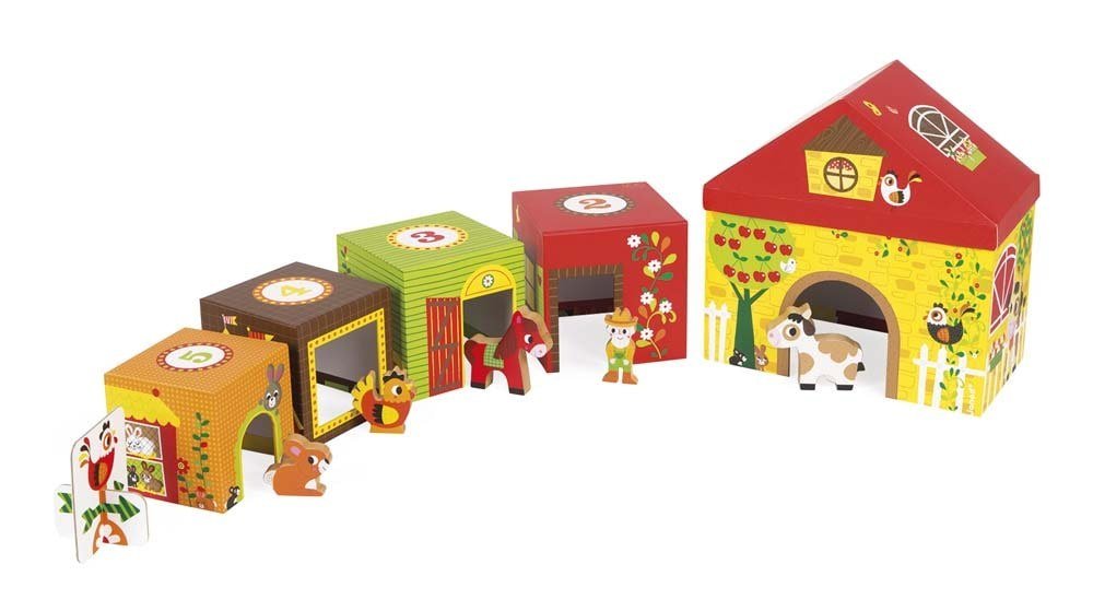 Πρόκειται για ένα παιχνίδι επιδεξιότητας με ένα φανταστικό χαρτονένιο κουτί σε σχήμα φάρμας, που περιλαμβάνει ένα σετ 5 κύβων από σκληρό χαρτόνι και 5 ξύλινες φιγούρες (4 ζωάκια και 1 αγρότη). Κάθε κύβος αντιπροσωπεύει ταυτόχρονα το σπίτι κάθε ζώου της φάρμας κι έναν αριθμό. Κατάλληλο από 12 μηνών.