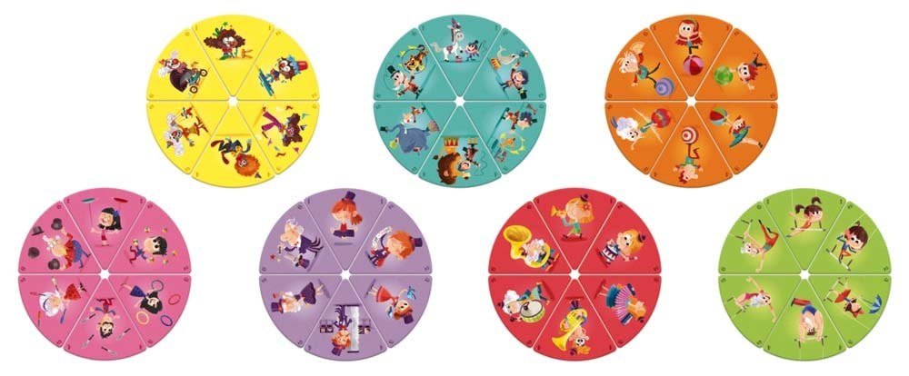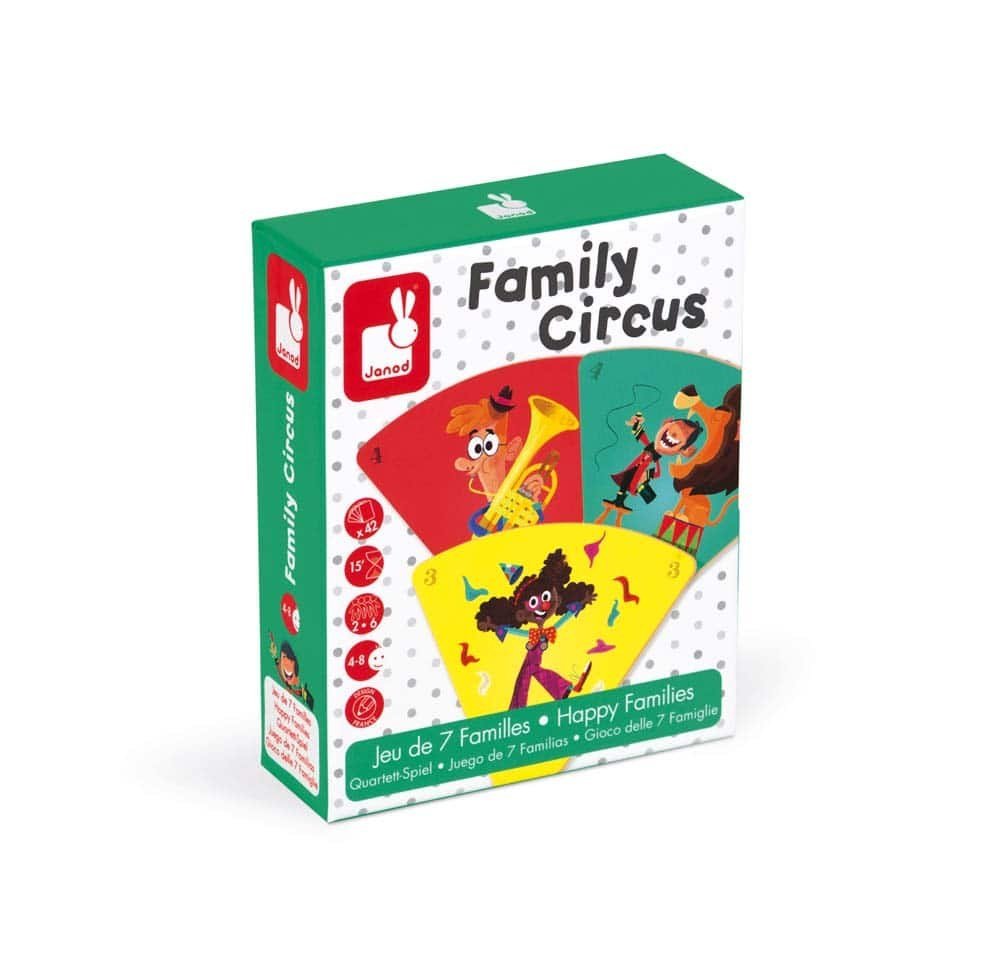 Από 2 έως 6 παίκτες. Το παιχνίδι «Χαρούμενες Οικογένειες» (με 42 κάρτες) αντλεί έμπνευση από το τσίρκο (κλόουν, εκπαιδευτές ζώων, μάγους, ανθρώπους που περπατούν σε ξυλοπόδαρα, μουσικούς, ζογκλέρ, οικογένειες που κάνουν ακροβατικά). Το τριγωνικό σχήμα των καρτών είναι εργονομικό, και τα παιδιά τις πιάνουν πιο εύκολα. Κάθε οικογένεια αποτελείται από 6 χαρακτήρες: τον πατέρα, τη μητέρα, τον γιο, την κόρη, τον παππού και τη γιαγιά. Κάθε οικογένεια εκπροσωπείται από ένα χρώμα, και κάθε χαρακτήρας έχει έναν αριθμό, ώστε να είναι εύκολο το παιχνίδι για τα νήπια. Κάρτες 10 x 9,8 εκ. Οι κανόνες του παιχνιδιού είναι γραμμένοι στα γαλλικά, στα αγγλικά, στα γερμανικά, στα ολλανδικά, στα ισπανικά και στα ιταλικά. Επιπλέον βοηθητική κάρτα συμπεριλαμβάνεται στη συσκευασία. Συρταρωτό κουτί με αυτοκόλλητο ασφαλείας.