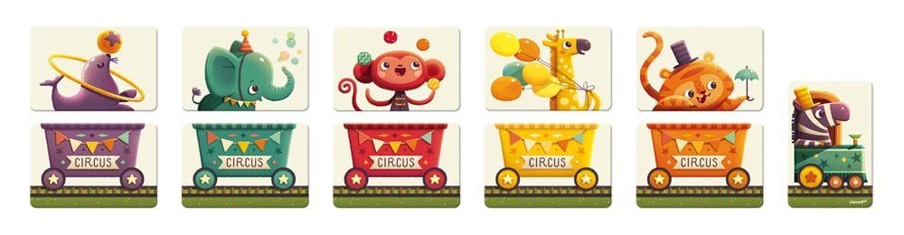 Από 2 έως 4 παίκτες. Παιχνίδι ταιριάσματος. 54 κάρτες σε συρταρωτό κουτί, εύκολο στη μεταφορά. Γίνε ο πρώτος που θα φτιάξει ξανά το τρένο με τα πέντε βαγόνια μαζί με όλα τα ζώα που μεταφέρει. Το παιχνίδι είναι ιδανικό για νήπια. Θα βοηθήσει το παιδί να μάθει τα ζώα και να ταιριάξει χρώματα, αναπτύσσοντας παράλληλα τις λεπτές κινητικές του δεξιότητες. 54 κάρτες, διάστασης 7 x 10,5 εκ., 1 ζάρι. Οι κανόνες του παιχνιδιού είναι γραμμένοι στα γαλλικά, στα αγγλικά, στα γερμανικά, στα ολλανδικά, στα ισπανικά και στα ιταλικά. Δύο επιπλέον βοηθητικές κάρτες συμπεριλαμβάνονται στη συσκευασία. Συρταρωτό κουτί με αυτοκόλλητο ασφαλείας.