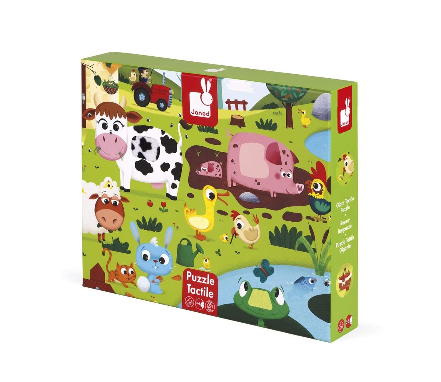 Μεγάλου μεγέθους παζλ 20 κομματιών από σκληρό χαρτόνι, με 7 κομμάτια με διαφορετική υφή (γούνα για την αγελάδα και το πρόβατο, απομίμηση ουράς για το λαγουδάκι, το γουρούνι, τη χήνα, το λειρί του κόκορα και το βατραχάκι). Εικονογράφηση με ζωηρά χρώματα με θέμα «Τα ζώα της φάρμας». Συμπεριλαμβάνεται αφίσα. Παζλ: 65 x 50 εκ. Συσκευασία: σκληρό πακέτο με διαφορετικές υφές στο καπάκι.