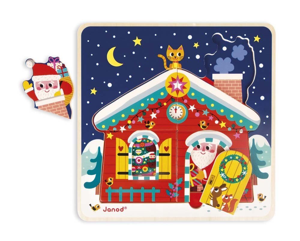 Αυτό το υπέροχο, πολυεπίπεδο ξύλινο παζλ με θέμα τη νύχτα των Χριστουγέννων θα βοηθήσει το παιδί να αναπτύξει την παρατηρητικότητά του και τη λεπτή του κινητικότητα. Το πρώτο επίπεδο παρουσιάζει τον Άγιο Βασίλη να κατεβαίνει από την καμινάδα (6 τεμάχια), στο δεύτερο επίπεδο αφήνει τα δώρα κάτω από το χριστουγεννιάτικο δέντρο (3 τεμάχια) και στο τελευταίο επίπεδο τα παιδιά ανακαλύπτουν τα δώρα τους (2 τεμάχια).Ζήστε τη μαγεία των Χριστουγέννων με ένα παραμυθένιο ξύλινο παζλ! Κατάλληλο από 2 έως 4 ετών.