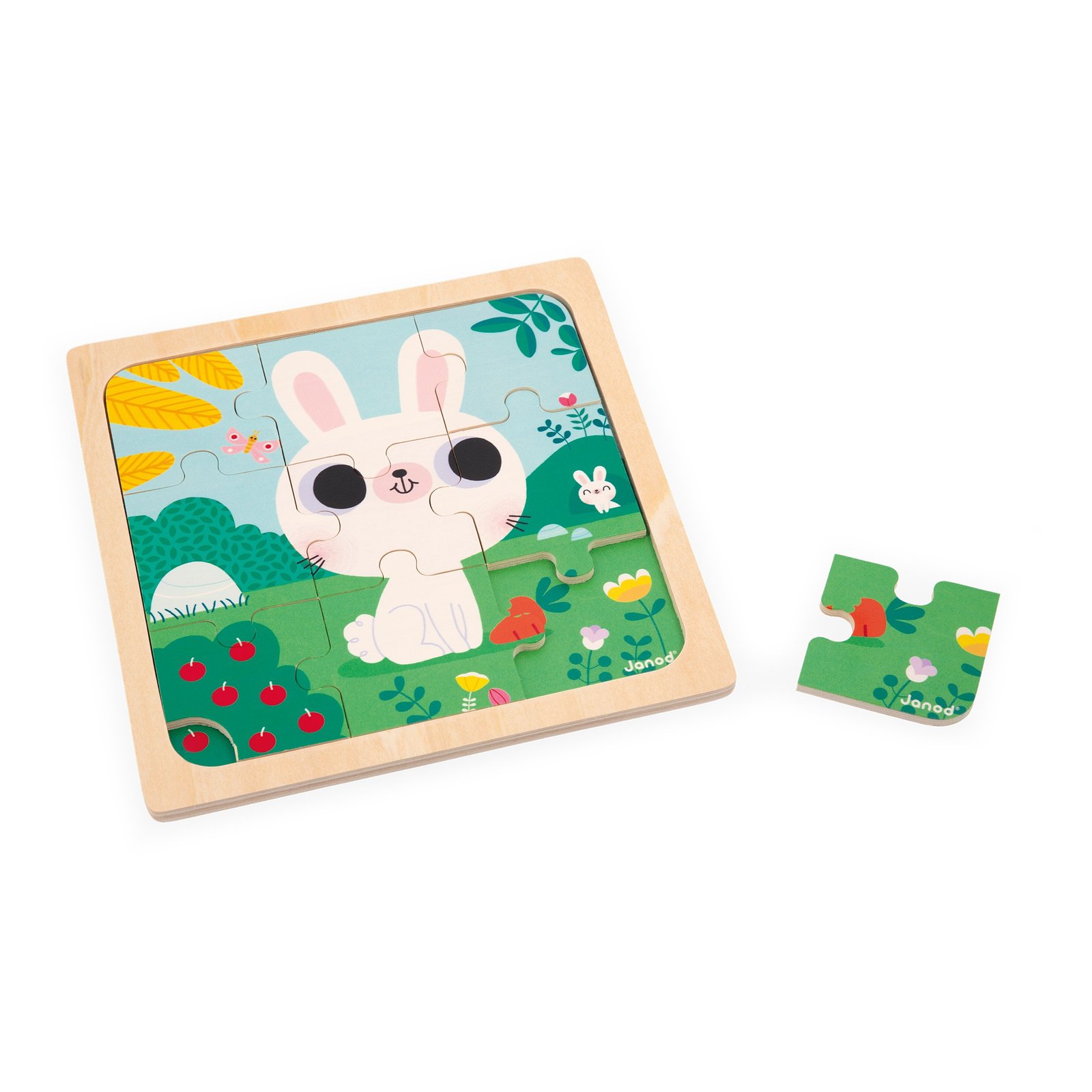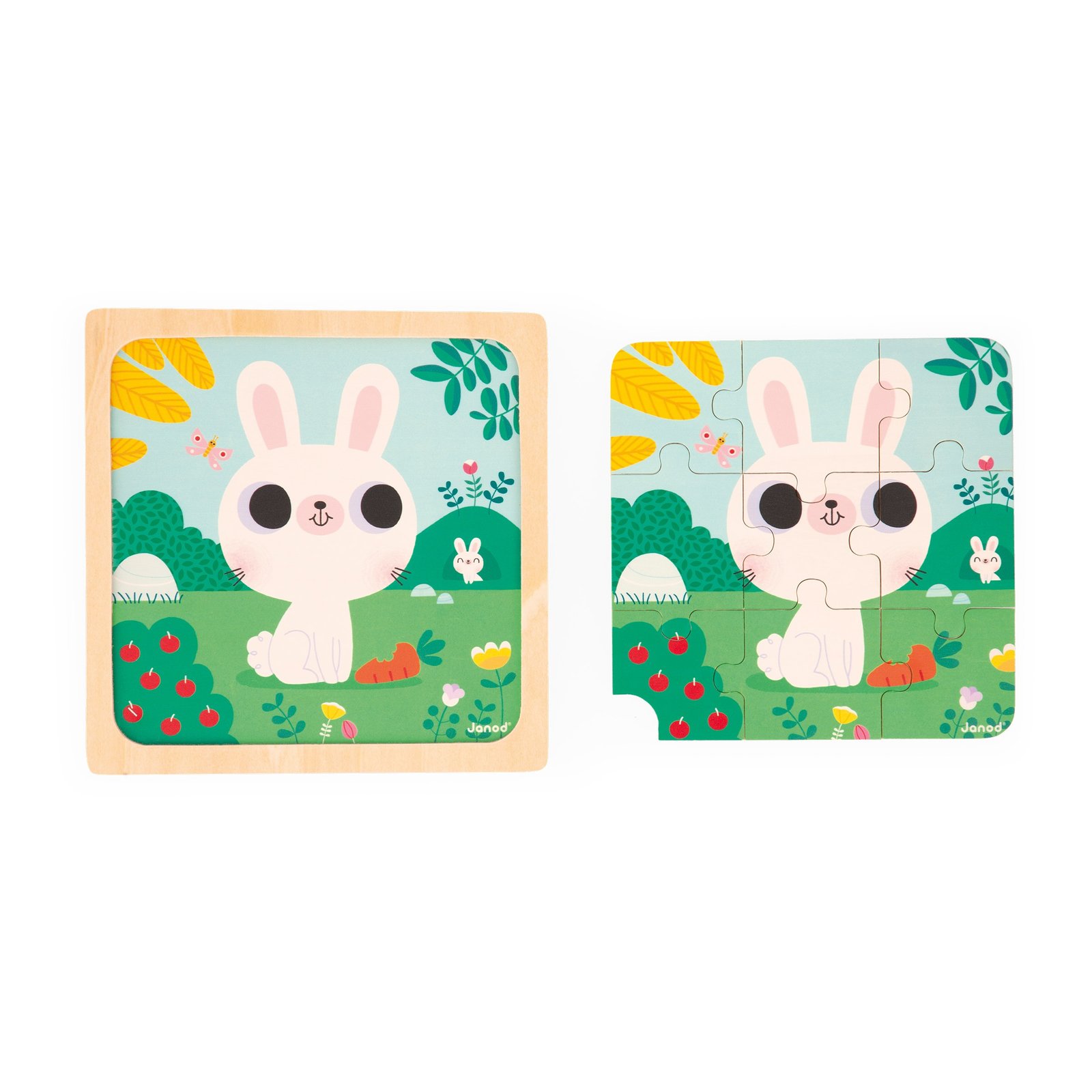Το κουνελάκι και τα καρότα του! Ένα χαριτωμένο πολύχρωμο παζλ που απεικονίζει ένα λευκό κουνέλι να μασουλάει καρότα. Περιλαμβάνει 9 ξύλινα κομμάτια και μια εσοχή για εύκολη αφαίρεση των κομματιών. Κάτω από το παζλ υπάρχει ένα εκτυπωμένο μοντέλο, ιδανικό για να βοηθήσει τα μικρότερα παιδιά στη συναρμολόγηση. Αυτό το διασκεδαστικό παζλ θα βοηθήσει το παιδί σας να αναπτύξει τις λεπτές κινητικές δεξιότητες, τη συγκέντρωση αλλά και την ανεξαρτησία του. Παιχνίδι για τα πρώτα χρόνια του παιδιού, κατασκευασμένο από ξύλο πιστοποιημένο από το Συμβούλιο Διαχείρισης των Δασών (FSCTM), κατάλληλο για παιδιά ηλικίας από 18 μηνών και άνω.