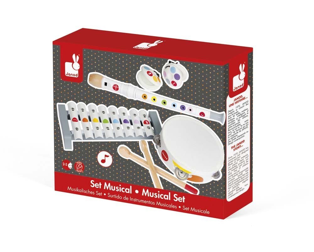 Tο πολύχρωμο αυτό σετ μουσικής 4 τεμαχίων αποτελείται από μεταλλόφωνο με 8 νότες, φλογέρα, ταμπουρίνο και καστανιέτες. Με το σετ αυτό τα παιδιά θα αγαπήσουν τα μουσικά όργανα και θα δημιουργήσουν τους πρώτους τους μουσικούς αυτοσχεδιασμούς. Κατάλληλο από 18 μηνών.