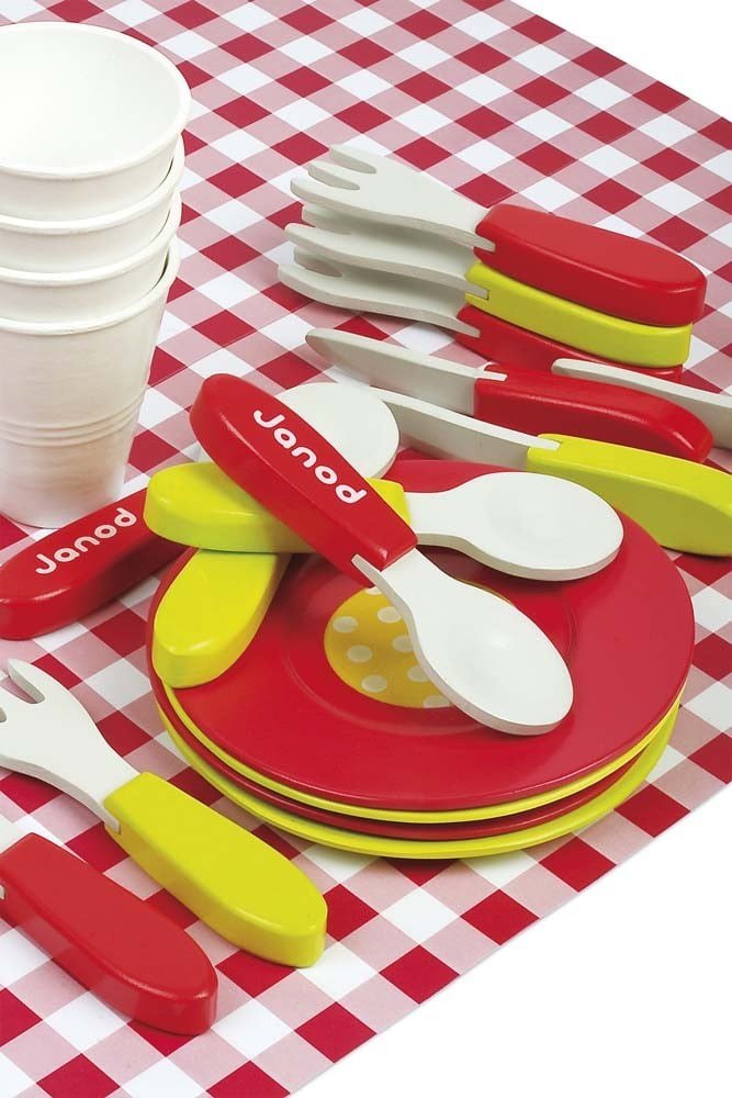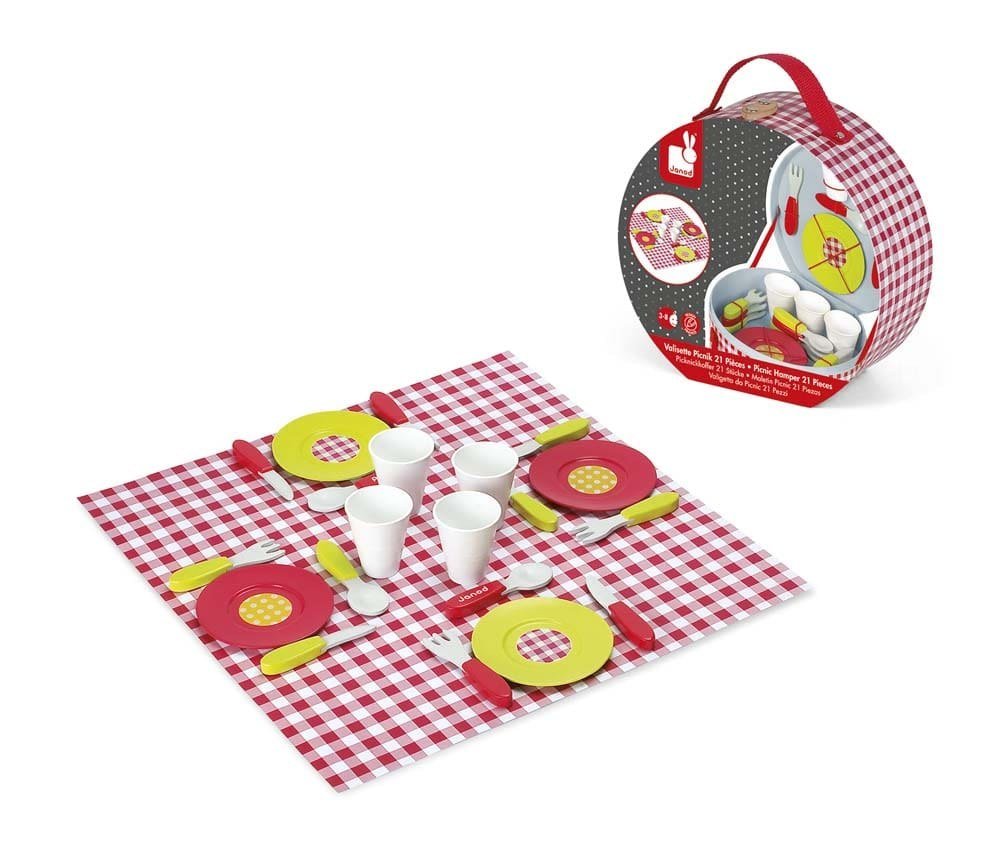 Με αυτό το φορητό βαλιτσάκι, που περιέχει όλα τα απαραίτητα αξεσουάρ, το επόμενο πικ νικ σας θα είναι ιδιαίτερα επιτυχημένο! Μέσα στη συσκευασία θα βρείτε τέσσερα ποτήρια, τέσσερα πιάτα, τέσσερα κουτάλια, τέσσερα πιρούνια και τέσσερα μαχαίρια, όλα ξύλινα, καθώς και ένα υφασμάτινο τραπεζομάντιλο! Κατάλληλο για παιδιά άνω των 3 ετών.
