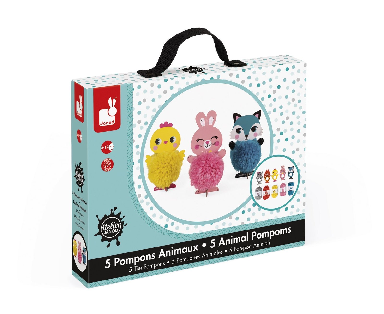 Κουτί που περιέχει 5 ζωάκια πομ-πομ που θα φτιάξεις μόνος σου. Κάθε ζώο αποτελείται από το σώμα και τα πόδια, έναν δίσκο από χαρτόνι και μια μπάλα μαλλί για να φτιάξεις το πομ-πομ. Για να φτιάξεις το πομ-πομ, θα πρέπει να τοποθετήσεις τον δίσκο επάνω στο ζώο και να τυλίξεις το νήμα γύρω του, περνώντας το από τη σχισμή που υπάρχει γι’ αυτό τον σκοπό. Όταν τυλίξεις όλη την μπάλα γύρω από το ζώο, θα πρέπει να κόψεις το νήμα γύρω γύρω, βάζοντας το ψαλίδι σου ανάμεσα στον ζώο και στον δίσκο. Μετά θα δέσεις το πομ-πομ με ένα κομμάτι νήμα και τότε μπορείς να αφαιρέσεις τον χάρτινο δίσκο. Έτοιμο! Στερέωσε τα πόδια στο ζώο και έχεις μια όμορφη φιγούρα. Ζωάκια που μπορείς να φτιάξεις: γάτα, λύκος, κοτόπουλο, αλεπού και λαγός. Συμπεριλαμβάνονται 5 μπάλες από μαλλί και 2 με ασημένια νήματα. Συμπεριλαμβάνεται 1 φυλλάδιο οδηγιών (μεταφρασμένο στα αγγλικά, στα γερμανικά, στα ολλανδικά, στα ισπανικά, στα ιταλικά και στα ρωσικά). Πωλείται σε βαλιτσάκι από σκληρό χαρτόνι με πλήρη εκτύπωση και υφασμάτινη λαβή. Εσωτερική στρώση αφρού για βέλτιστη προστασία. 2 διάφανα στρογγυλά αυτοκόλλητα εξασφαλίζουν το καλό κλείσιμο του κουτιού. Προστατευτική πλαστική θήκη για τη μεταφορά.