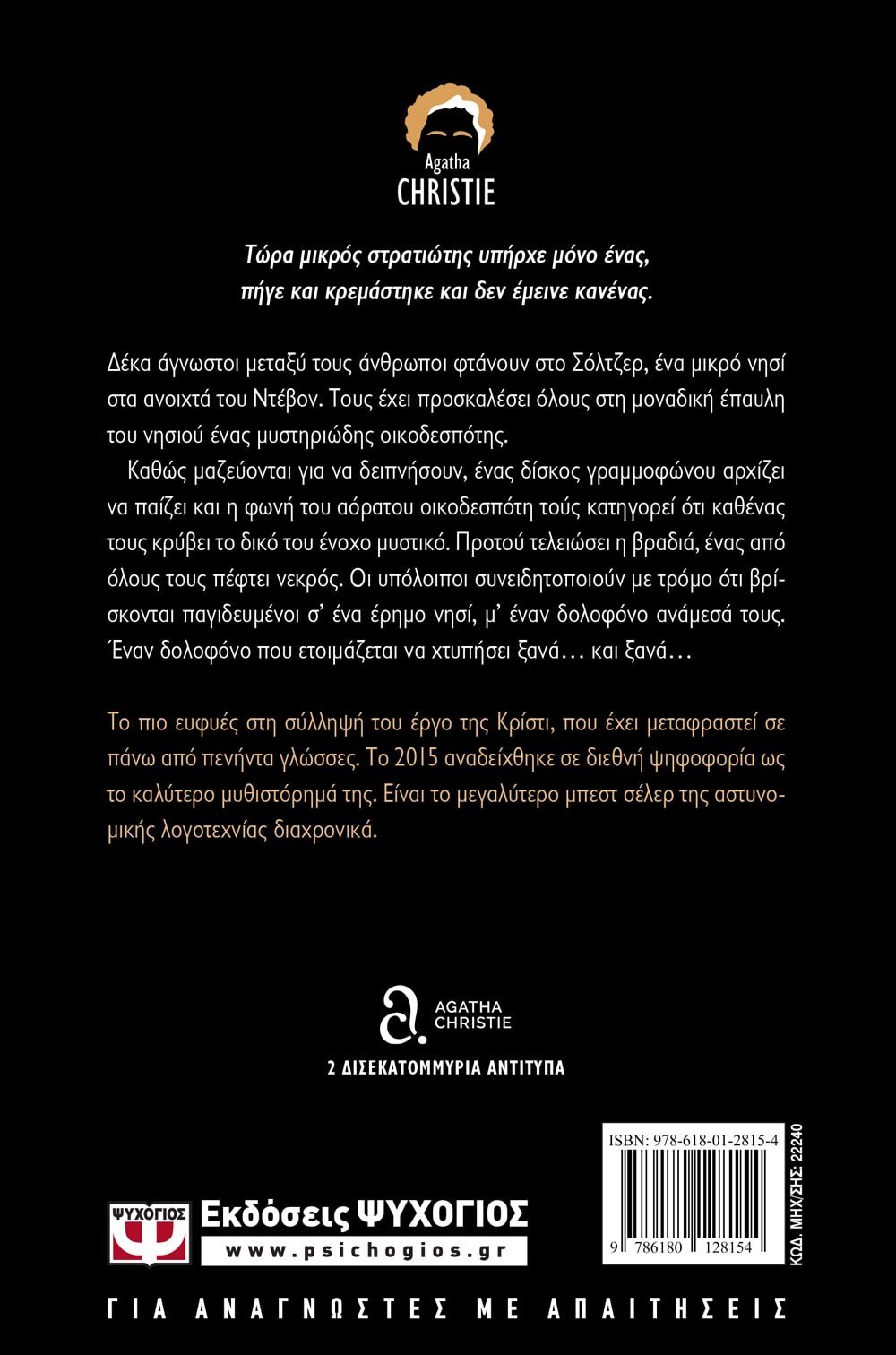 «Τώρα μικρός στρατιώτης υπήρχε μόνο ένας,πήγε και κρεμάστηκε και δεν έμεινε κανένας».Δέκα άγνωστοι μεταξύ τους άνθρωποι φτάνουν στο Σόλτζερ, ένα μικρό νησί στα ανοιχτά του Ντέβον. Τους έχει προσκαλέσει όλους στη μοναδική έπαυλη του νησιού ένας μυστηριώδης οικοδεσπότης.Καθώς μαζεύονται για να δειπνήσουν, ένας δίσκος γραμμοφώνου αρχίζει να παίζει και η φωνή του αόρατου οικοδεσπότη τούς κατηγορεί ότι καθένας κρύβει το δικό του ένοχο μυστικό. Προτού τελειώσει η βραδιά, ένας από όλους τους πέφτει νεκρός. Οι υπόλοιποι συνειδητοποιούν με τρόμο ότι βρίσκονται παγιδευμένοι σ’ ένα έρημο νησί, μ’ έναν δολοφόνο ανάμεσά τους. Έναν δολοφόνο που ετοιμάζεται να χτυπήσει ξανά… και ξανά…Το πιο ευφυές στη σύλληψή του έργο της Κρίστι, που έχει μεταφραστεί σε πάνω από πενήντα γλώσσες. Το 2015 αναδείχτηκε σε διεθνή ψηφοφορία ως το καλύτερό της μυθιστόρημα. Είναι το μεγαλύτερο μπεστ σέλερ της αστυνομικής λογοτεχνίας διαχρονικά.