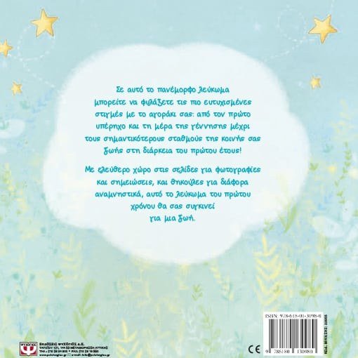 Σε αυτό το πανέµορφο λεύκωµα µπορείτε να φυλάξετε τις πιο ευτυχισµένες στιγµές µε το αγοράκι σας: από τον πρώτο υπέρηχο και τη µέρα της γέννησης µέχρι τους σηµαντικότερους σταθµούς της κοινής σας ζωής στη διάρκεια του πρώτου έτους! Με ελεύθερο χώρο στις σελίδες για φωτογραφίες και σηµειώσεις, και θηκούλες για διάφορα αναµνηστικά, αυτό το λεύκωµα του πρώτου χρόνου θα σας συγκινεί για µια ζωή.