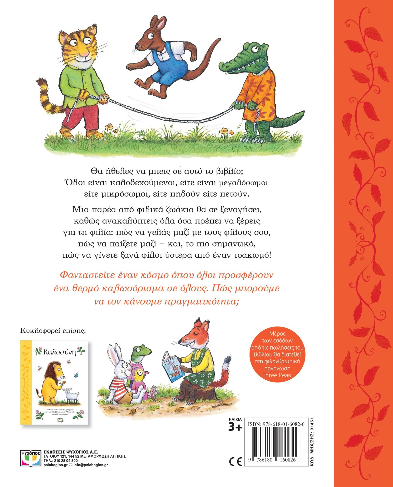 Θα ήθελες να μπεις σε αυτό το βιβλίο;Όλοι είναι καλοδεχούμενοι, είτε είναι μεγαλόσωμοι είτε μικρόσωμοι, είτε πηδούν είτε πετούν.Μια παρέα από φιλικά ζωάκια θα σε ξεναγήσει, καθώς ανακαλύπτεις όλα όσα πρέπει να ξέρεις για τη φιλία: πώς να γελάς μαζί με τους φίλους σου, πώς να παίζετε μαζί – και, το πιο σημαντικό, πώς να γίνετε ξανά φίλοι ύστερα από έναν τσακωμό!Φανταστείτε έναν κόσμο όπου όλοι προσφέρουν ένα θερμό καλωσόρισμα σε όλους. Πώς μπορούμε να τον κάνουμε πραγματικότητα;