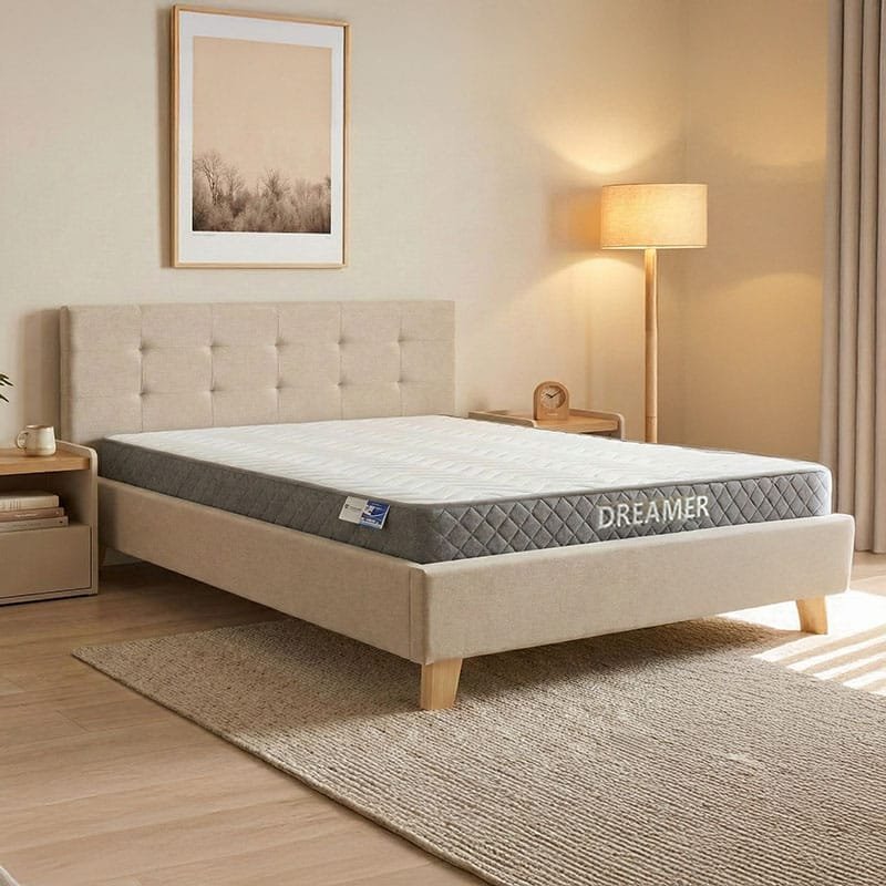 Κρεβάτι με στρώμα Mago-Dreamer pakoworld ύφασμα εκρού – ξύλινο πόδι σε φυσική απόχρωση 160×200εκ