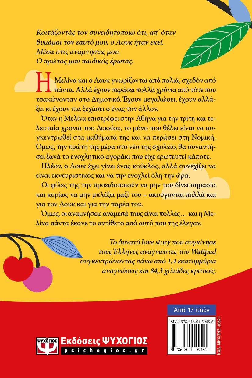 Κοιτάζοντάς τον συνειδητοποιώ ότι, από τότε που θυμάμαι τον εαυτό μου, ο Λουκ ήταν εκεί. Μέσα στις αναμνήσεις μου. Ο πρώτος μου παιδικός έρωτας.Η Μελίνα και ο Λουκ γνωρίζονται από παλιά, σχεδόν από πάντα. Αλλά έχουν περάσει πολλά χρόνια από τότε που τσακώνονταν στο Δημοτικό. Έχουν μεγαλώσει, έχουν αλλάξει κι έχουν πια ξεχάσει ο ένας τον άλλον.Όταν η Μελίνα επιστρέφει στην Αθήνα για την τρίτη και τελευταία χρονιά του Λυκείου, το μόνο που θέλει είναι να αφοσιωθεί στα μαθήματά της και να περάσει στη Νομική. Όμως, την πρώτη της μέρα στο νέο της σχολείο, θα συναντήσει ξανά το ενοχλητικό αγοράκι που είχε ερωτευτεί κάποτε. Πλέον, ο Λουκ έχει γίνει ένας κούκλος, αλλά συνεχίζει να είναι εκνευριστικός και την ενοχλεί όλη την ώρα.Οι φίλες της την προειδοποιούν να μην του δίνει σημασία και κυρίως να μην μπλέξει μαζί του – ακούγονται πολλά και για τον Λουκ και για την παρέα του.Ωστόσο, οι αναμνήσεις που τη συνδέουν μαζί του είναι πολλές… και η Μελίνα πάντα έκανε το αντίθετο από αυτό που της έλεγαν.Το δυνατό love story που συγκίνησε τους Έλληνες αναγνώστες του Wattpad συγκεντρώνοντας πάνω από 1,4 εκατομμύρια αναγνώσεις και 84,3 χιλιάδες κριτικές.