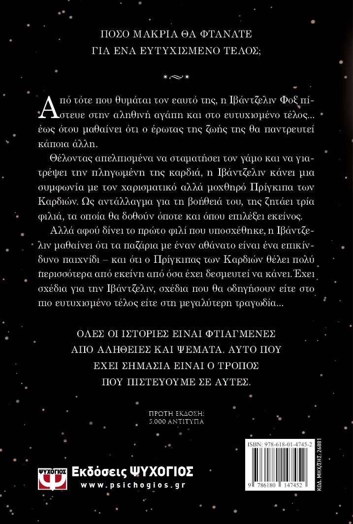 ΠΟΣΟ ΜΑΚΡΙΑ ΘΑ ΦΤΑΝΑΤΕ ΓΙΑ ΕΝΑ ΕΥΤΥΧΙΣΜΕΝΟ ΤΕΛΟΣ;Από τότε που θυμάται τον εαυτό της, η Ιβάντζελιν Φοξ πίστευε στην αληθινή αγάπη και στο ευτυχισμένο τέλος… έως ότου μαθαίνει ότι ο έρωτας της ζωής της θα παντρευτεί κάποια άλλη. Θέλοντας απελπισμένα να σταματήσει τον γάμο και να γιατρέψει την πληγωμένη της καρδιά, η Ιβάντζελιν κάνει μια συμφωνία με τον χαρισματικό αλλά μοχθηρό Πρίγκιπα των Καρδιών. Ως αντάλλαγμα για τη βοήθειά του, της ζητάει τρία φιλιά, τα οποία θα δοθούν όποτε και όπου επιλέξει εκείνος. Αλλά αφού δίνει το πρώτο φιλί που υποσχέθηκε, η Ιβάντζελιν μαθαίνει ότι τα παζάρια με έναν αθάνατο είναι ένα επικίνδυνο παιχνίδι – και ότι ο Πρίγκιπας των Καρδιών θέλει πολύ περισσότερα από εκείνη από όσα είχε δεσμευτεί να κάνει. Έχει σχέδια για την Ιβάντζελιν, σχέδια που θα οδηγήσουν είτε στο πιο ευτυχισμένο τέλος είτε στη μεγαλύτερη τραγωδία…ΟΛΕΣ ΟΙ ΙΣΤΟΡΙΕΣ ΕΙΝΑΙ ΦΤΙΑΓΜΕΝΕΣ ΑΠΟ ΑΛΗΘΕΙΕΣ ΚΑΙ ΨΕΜΑΤΑ. ΑΥΤΟ ΠΟΥ ΕΧΕΙ ΣΗΜΑΣΙΑ ΕΙΝΑΙ Ο ΤΡΟΠΟΣ ΠΟΥ ΠΙΣΤΕΥΟΥΜΕ ΣΕ ΑΥΤΕΣ.