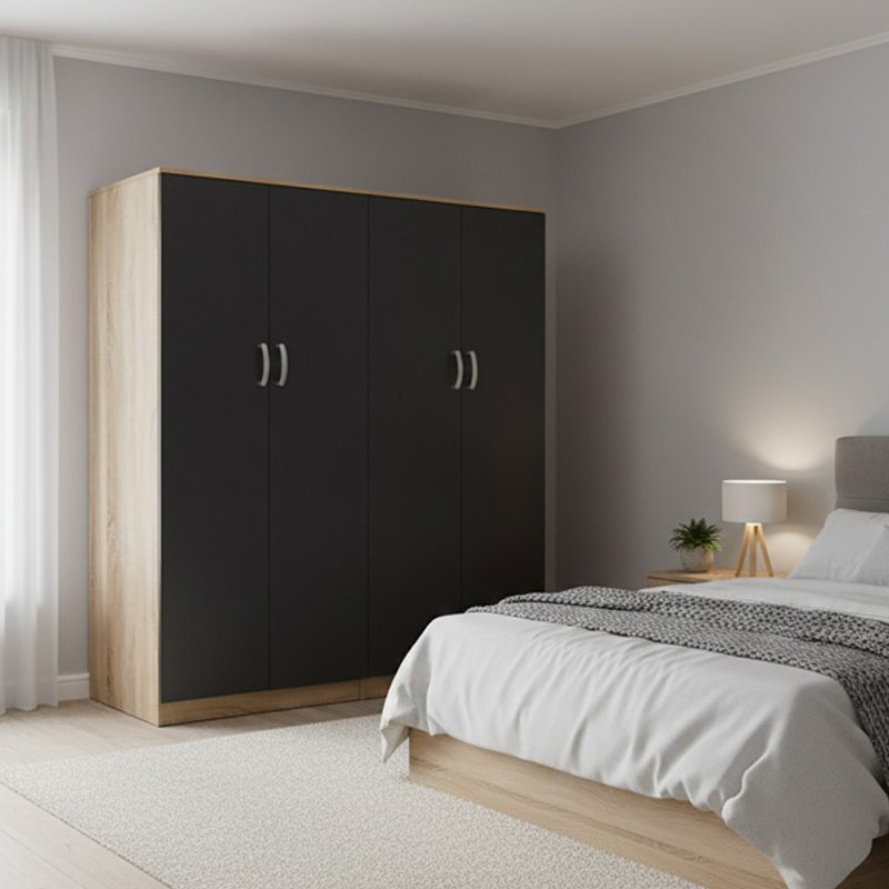 - Περιλαμβάνει τεσσερις πόρτες, εσωτερικά φέρει ράγα για κρεμάστρες και ράφια για την αποθήκευση ρούχων και αξεσουάρ.