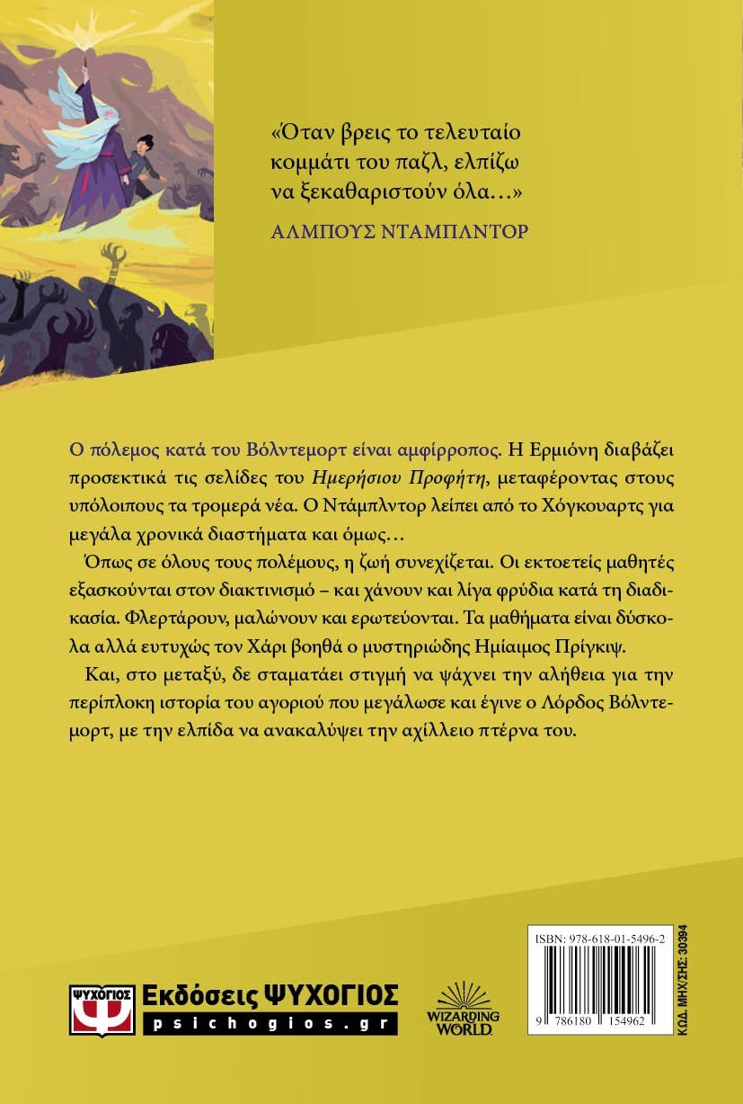 «Όταν βρεις το τελευταίο κομμάτι του παζλ, ελπίζω να ξεκαθαριστούν όλα…»ΑΛΜΠΟΥΣ ΝΤΑΜΠΛΝΤΟΡΟ πόλεμος κατά του Βόλντεμορτ είναι αμφίρροπος. Η Ερμιόνη διαβάζει προσεκτικά τις σελίδες του Ημερήσιου Προφήτη, μεταφέροντας στους υπόλοιπους τα τρομερά νέα. Ο Ντάμπλντορ λείπει από το Χόγκουαρτς για μεγάλα χρονικά διαστήματα και όμως…Όπως σε όλους τους πολέμους, η ζωή συνεχίζεται. Οι εκτοετείς μαθητές εξασκούνται στον διακτινισμό – και χάνουν και λίγα φρύδια κατά τη διαδικασία. Φλερτάρουν, μαλώνουν και ερωτεύονται. Τα μαθήματα είναι δύσκολα αλλά ευτυχώς τον Χάρι βοηθά ο μυστηριώδης Ημίαιμος Πρίγκιψ.Και, στο μεταξύ, δε σταματάει στιγμή να ψάχνει την αλήθεια για την περίπλοκη ιστορία του αγοριού που μεγάλωσε και έγινε ο Λόρδος Βόλντεμορτ, με την ελπίδα να ανακαλύψει την αχίλλειο πτέρνα του.
