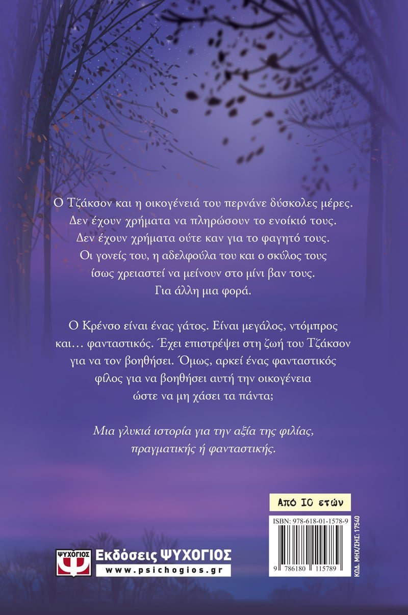 Ο Τζάκσον και η οικογένειά του περνάνε δύσκολες μέρες. Δεν έχουν χρήματα να πληρώσουν το ενοίκιό τους. Δεν έχουν χρήματα ούτε καν για το φαγητό τους. Οι γονείς του, η αδελφούλα του και ο σκύλος τους ίσως χρειαστεί να μείνουν στο μίνι βαν τους. Για άλλη μια φορά. Ο Κρένσο είναι ένας γάτος. Είναι μεγάλος, ντόμπρος και… φανταστικός. Έχει επιστρέψει στη ζωή του Τζάκσον για να τον βοηθήσει. Όμως, αρκεί ένας φανταστικός φίλος για να βοηθήσει αυτή την οικογένεια ώστε να μη χάσει τα πάντα; Μια γλυκιά ιστορία για την αξία της φιλίας, πραγματικής ή φανταστικής.