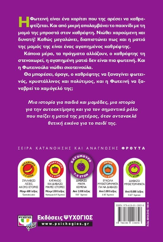 Η Φωτεινή είναι ένα κορίτσι που της αρέσει να καθρεφτίζεται. Και από μικρή απολαμβάνει το παιχνίδι με τη μαμά της μπροστά στον καθρέφτη. Νιώθει χαρούμενη και δυνατή! Καθώς μεγαλώνει, διαπιστώνει πως και η ματιά της μαμάς της είναι ένας αγαπημένος καθρέφτης. Κάποια μέρα, τα πράγματα αλλάζουν, ο καθρέφτης τη στενοχωρεί, η αγαπημένη ματιά δεν είναι πια φωτεινή. Και η Φωτεινούλα νιώθει σκοτεινούλα. Θα μπορέσει, άραγε, ο καθρέφτης να ξαναγίνει φωτεινός, κρυστάλλινος και πολύτιμος, και η Φωτεινή να ξαναβρεί το χαμόγελό της; Μια ιστορία για παιδιά και μαμάδες, μια ιστορία για την αυτοεκτίμηση και για τον σημαντικό ρόλο που παίζει η ματιά της μητέρας, όταν αντανακλά θετική εικόνα για το παιδί της.